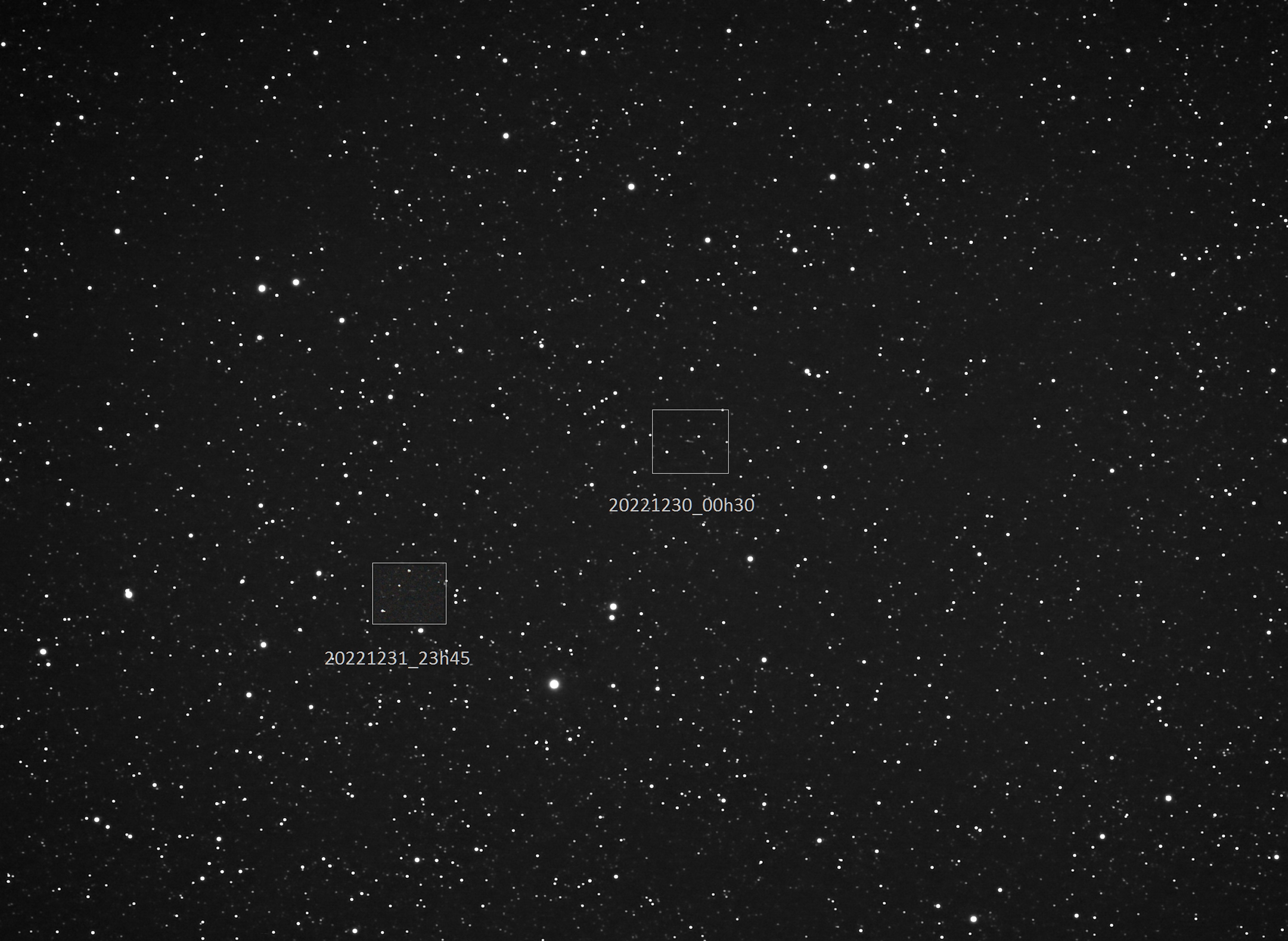 Eine heftige Grippe hatte uns den lustigen Silvesterabend ordentlich vermasselt und wir verbrachten den Abend mit etwa 100 Papiertaschentüchern vor dem Fernseher … bis ich nach 23 Uhr bemerkte, dass der Himmel ziemlich klar wurde. Da wollte ich doch wissen, ob es noch einmal möglich wäre, das James Webb Teleskop zu erhaschen und sah bei The Sky Live nach. Ok, müsste klappen … und es klappte. Schwacher Rauch von den Böllern verbesserte die Sicht nicht, aber immerhin, am 1. Januar nach dem Stacken konnte ich ihn schwach erkennen. Mein lichtstarker Newton würde hier mehr bringen als der 102/800 Refraktor, aber ein später Umbau war mir an diesem Abend zuviel des Guten.
