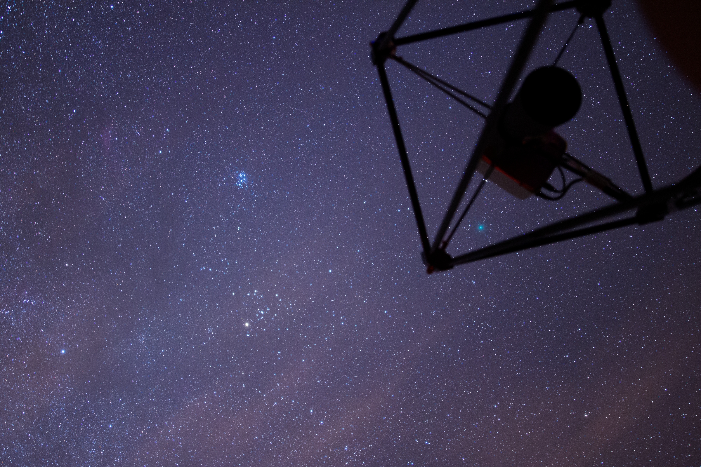 Nearly at zenith, comet 46P Wirtanen can be seen catched between vanes of spider which holds the camera situated on focus of Telescope TAR1 in Teide Observatory, meanwhile is photographed. This panorama includes the Pleiades star cluster near center of image, and a little beyond the red trace of California Nebula. At down, Hyades open star cluster, including the bright star Aldebaran, shape central part of constellation Taurus.
