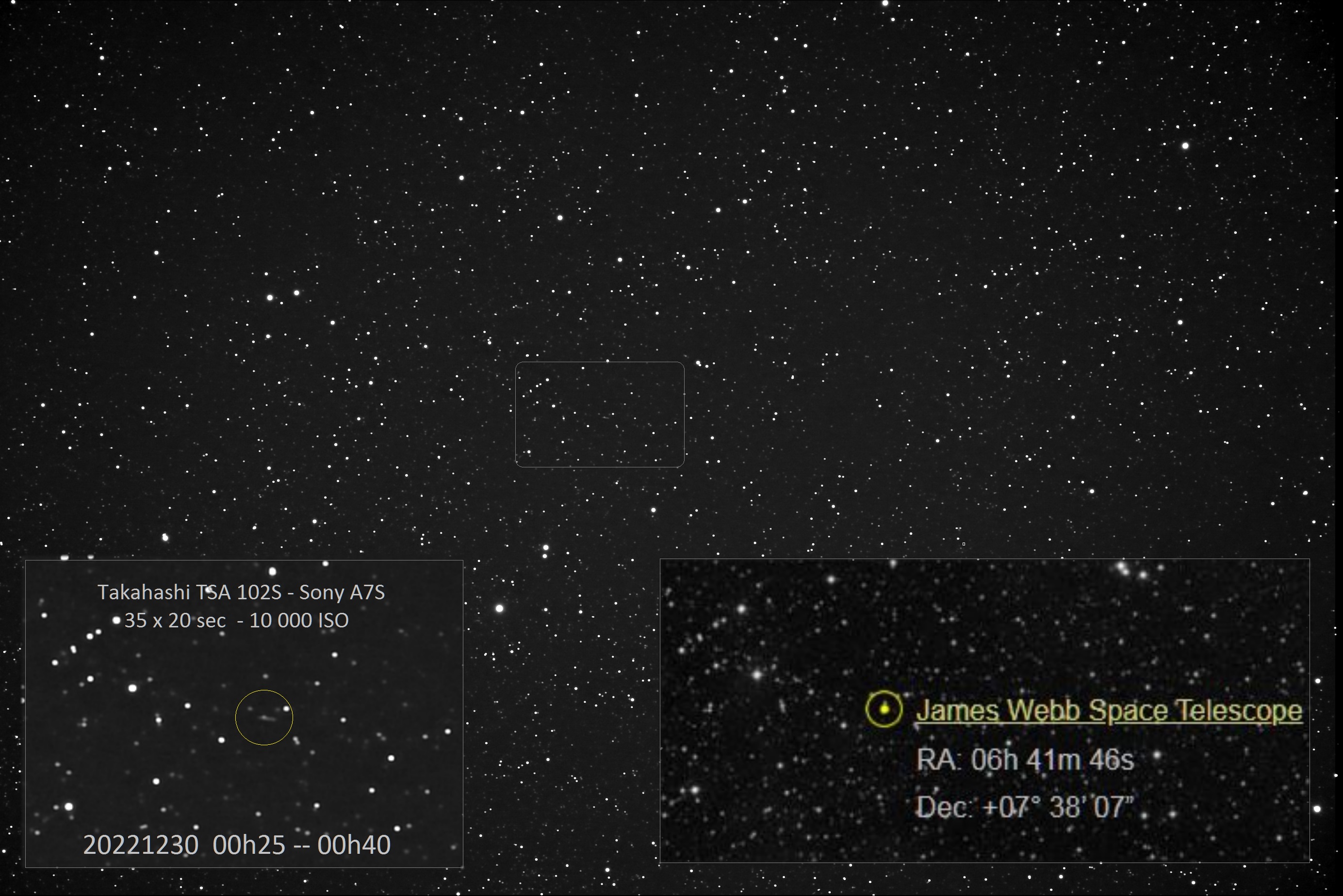 Am Freitagabend nach 22 Uhr war der Himmel unverhofft klar, und ich riskierte den Versuch, das James-Webb-Weltraumteleskop zu erblicken. Und der Versuch hat sich gelohnt. Er dreht langsam um den Lagrange-Punkt L2, etwa 1,5 Millionen Kilometer von unserer Erde entfernt, so dass 15 Minuten schon genügten, um seine Bewegung deutlich zu bemerken.