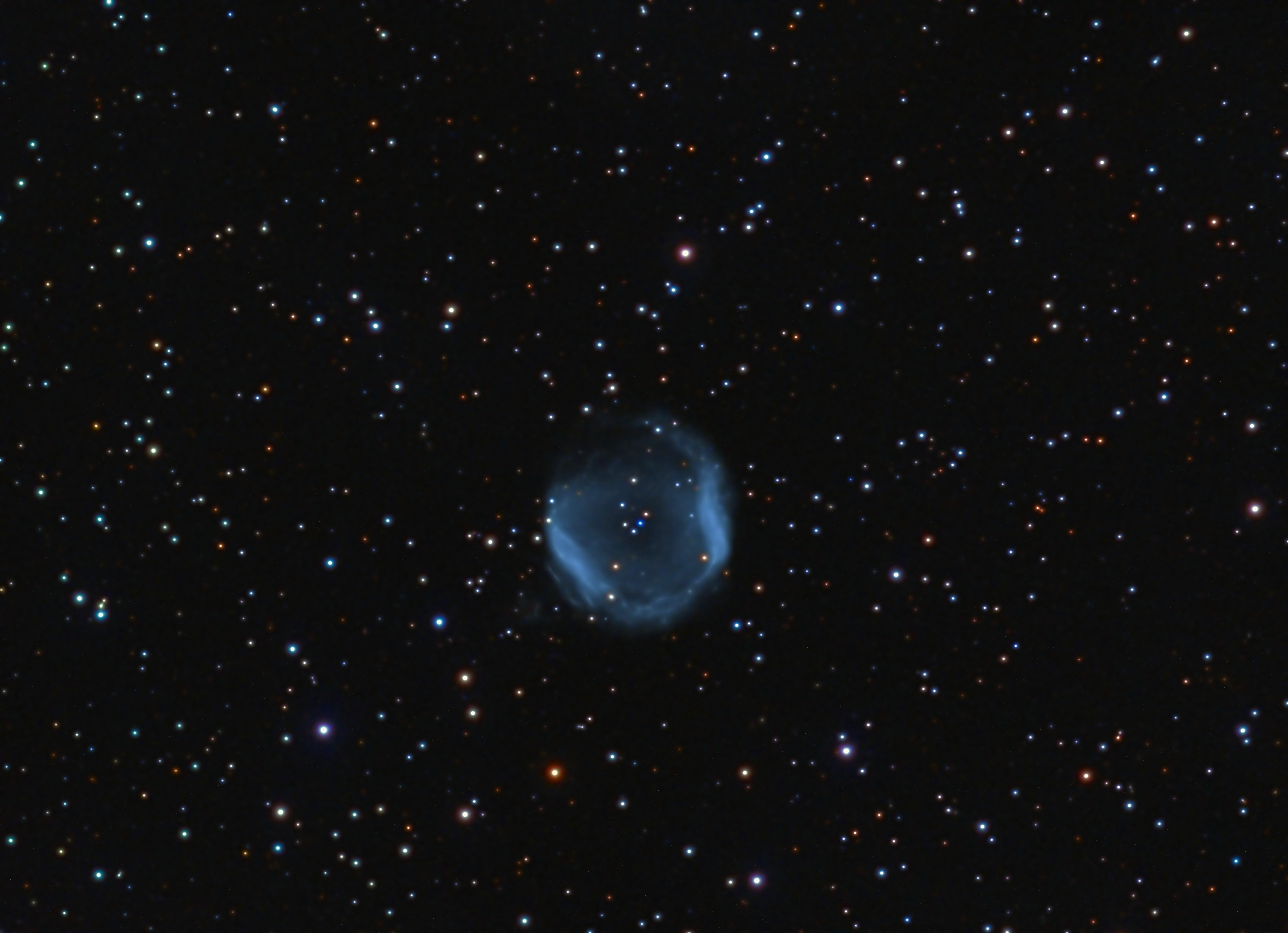 Ein erst 1941 entdeckter, sehr schwacher Planetarischer Nebel im Pegasus; als Luminanzaufnahme wurden 66 x 5 min Frames mit einem OIII-Filter verwendet, die Farben wurden aus je 15 x 2 min RGB-Frames erstellt