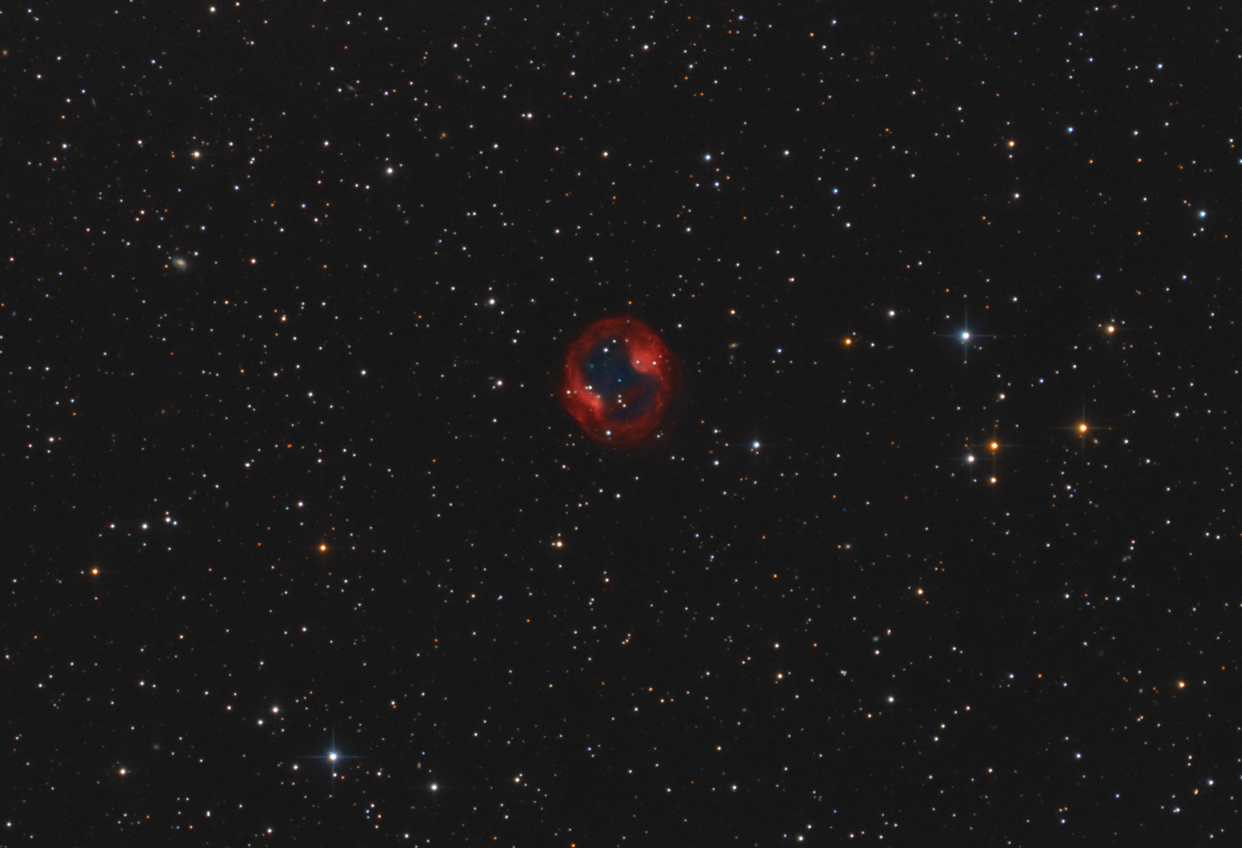 Dieser relativ große, aber sehr lichtschwache Planetarische Nebel befindet sich im Sternbild Luchs. Ich habe auch den zentralen (bläulichen) Weißen Zwerg, welcher der "verstorbene" Zentralstern des Gebildes ist, in der Mitte des Nebels sichtbar machen können. Die Bildbearbeitung mit H-Alpha- und RGB-Daten dauerte genauso lange wie die Aufnahme …