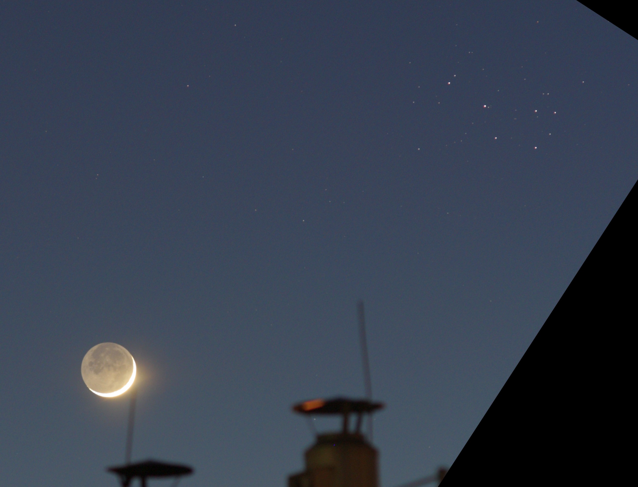 Ein wenig früher hätte ich beobachten sollen, da der Mond (zum Aufnahmezeitpunkt 10° hoch) schon fast hinter dem Hausdach verschwunden war. Der von der Sonne unbeleuchtete Teil der Mondsichel war in helles Erdlicht getaucht (aschgraues Mondlicht) und zusammen mit den Pleiaden gab es eine sehr schöne Himmelslandschaft zu bewundern.
