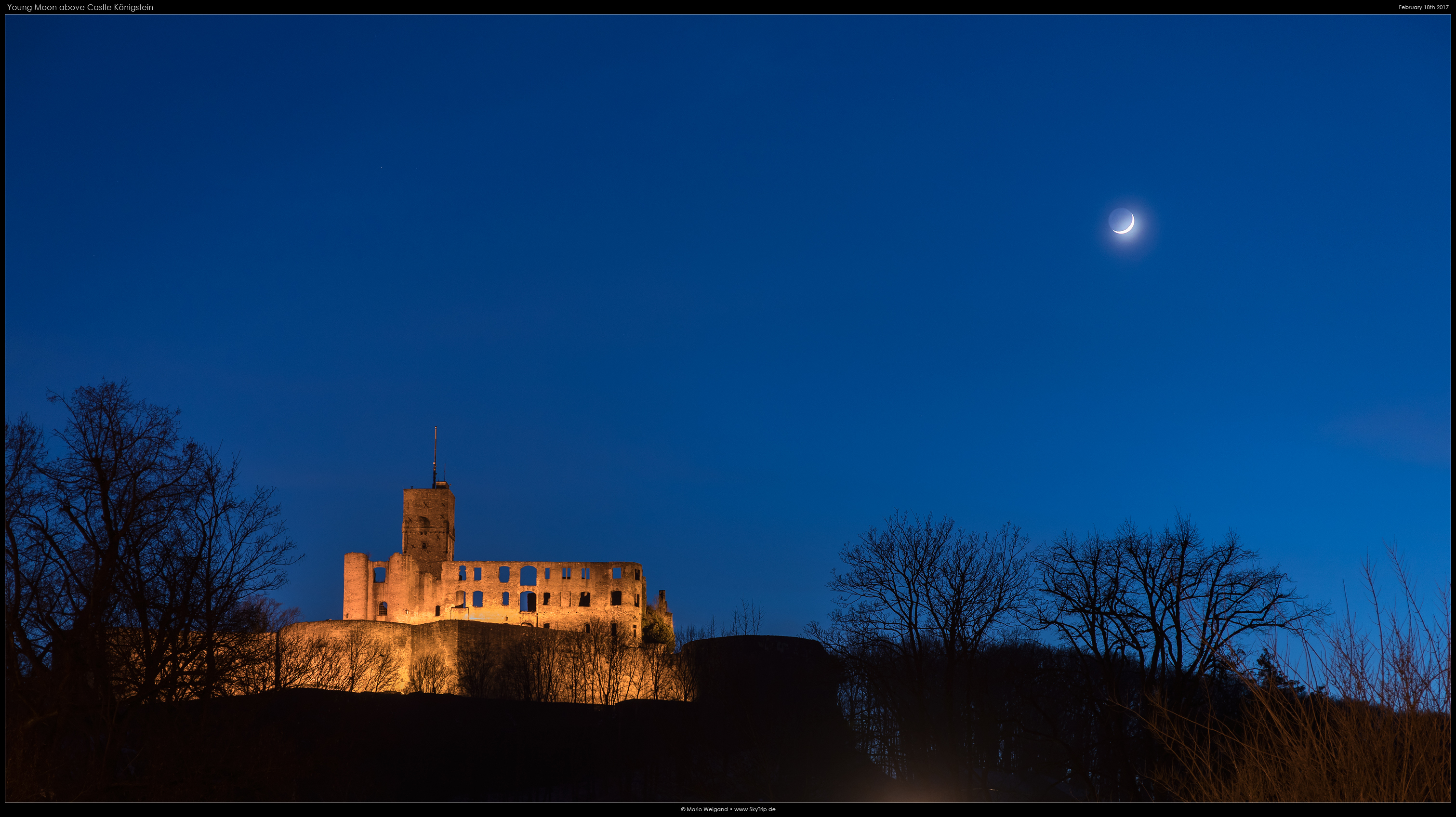 Am 18. Februar 2018 konnte der junge Mond mit Erdschein relativ hoch über dem Horizont beobachtet werden. Gutes Wetter mit lediglich dünner hoher Bewölkung nutzte ich, um den Mond über der Burgruine von Königstein festzuhalten.