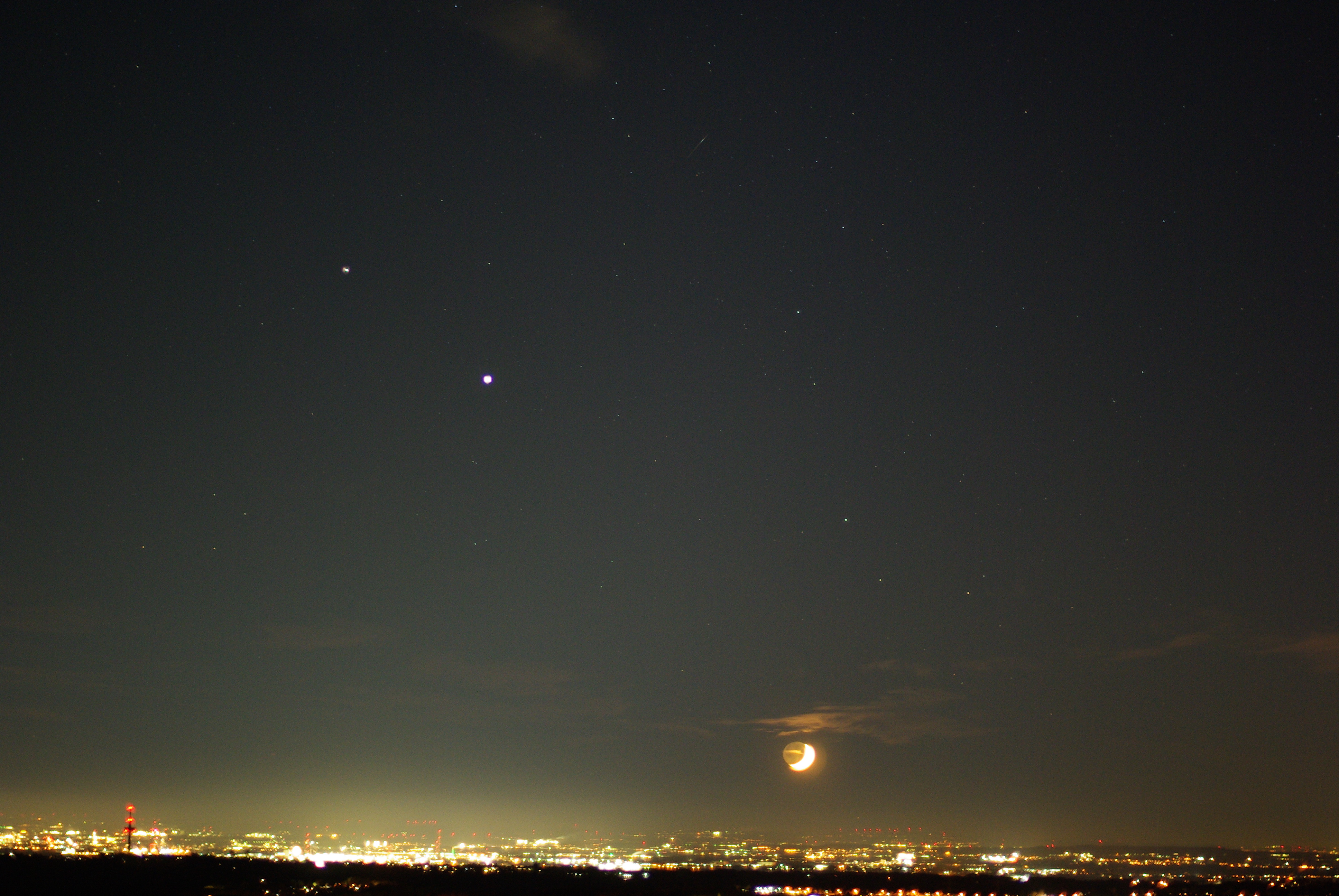 Leserbilder Astronomie: Junger Mond und die Riesenplaneten Jupiter und Saturn