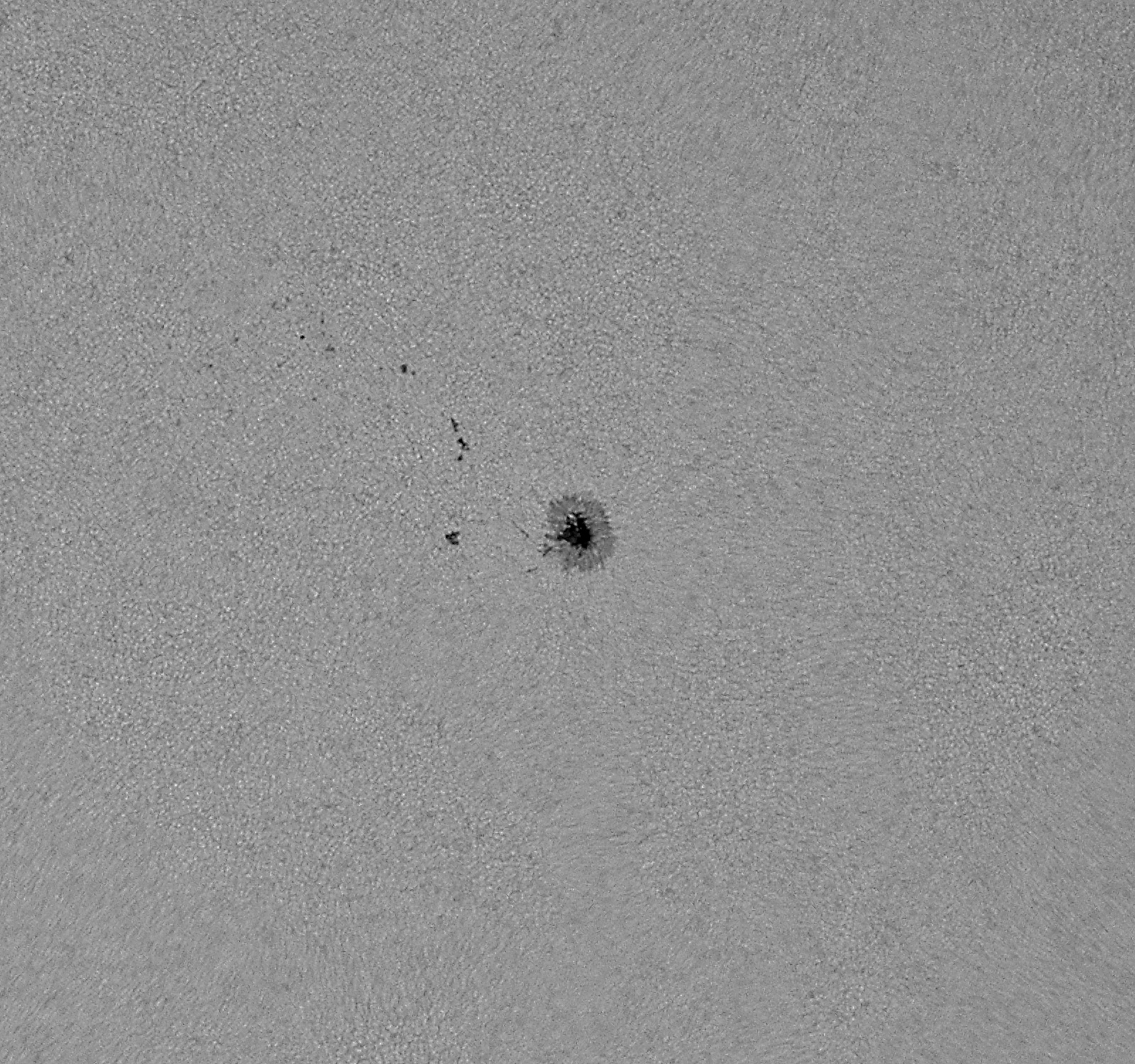 So früh am Tag ist das Seeing meist besser als gegen Mittag. So gelang ein Bild der aktiven Region AR 12827 mit einigen Details auch in der Umbra, die ja in Wirklichkeit gar nicht schwarz ist, sondern nur kühler als die umgebende Sonnenoberfläche und somit dunkler.