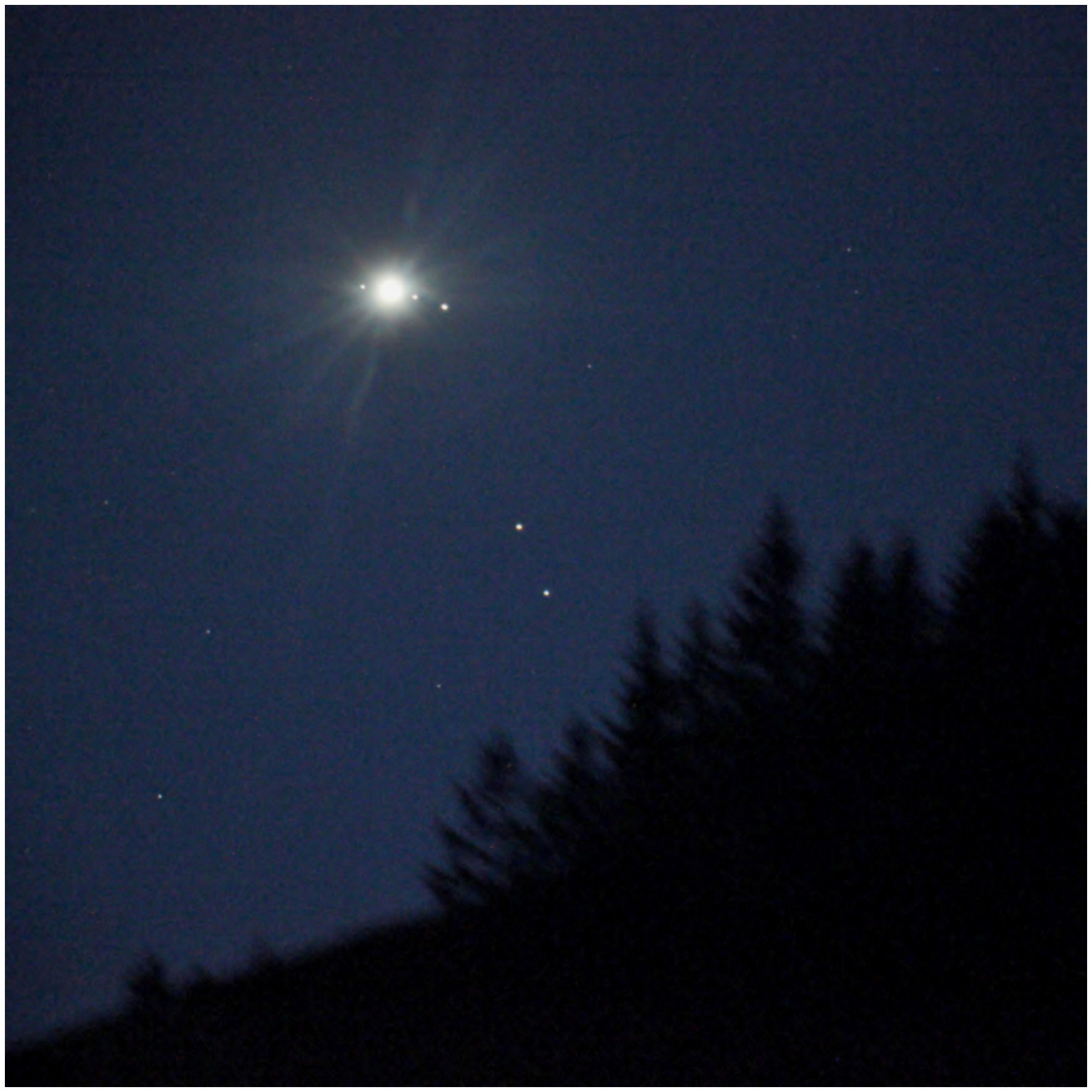 Genau sieben Stunden vor dem Eintritt der Sonde Juno in die Jupiterumlaufbahn entstand dieses Foto von dem untergehenden Planeten mit den Monden. Von links: Kallisto, Io und Ganymed. Der Mond Europa stand direkt rechts von Jupiter, er ging aber leider im Streulicht unter.