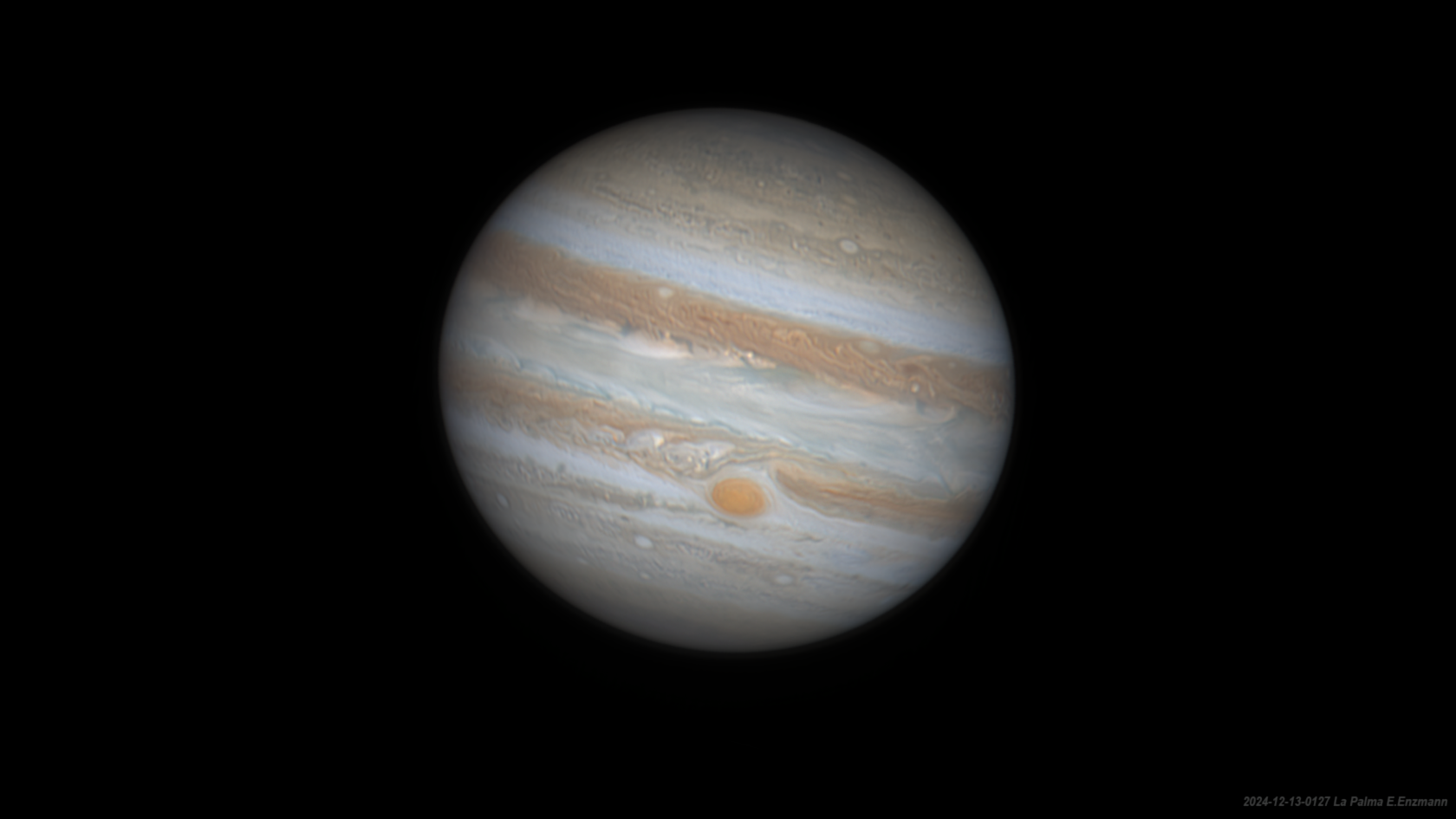 Jupiter unter guten Seeing-Bedingungen aus La Palma vom 13. Dezember 2024. Die Aufnahme ist aus 36 Videos mit je 120 Sekunden gemacht. Das Teleskop wurde dabei off axis betrieben.