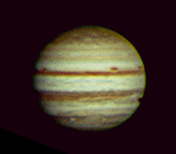 Am 15.1.2012 war es zwar -5 °C kalt, aber ich wollte unbedigt mein neues 5-fach-Barlow mit meiner einfachen Webcam am 10"-Dobson ausprobieren. Aufnahme mit VGA, 47 s lang, dann mit Giotto bearbeitet und geschärft. Mein erstes, gutes Bild vom Jupiter.