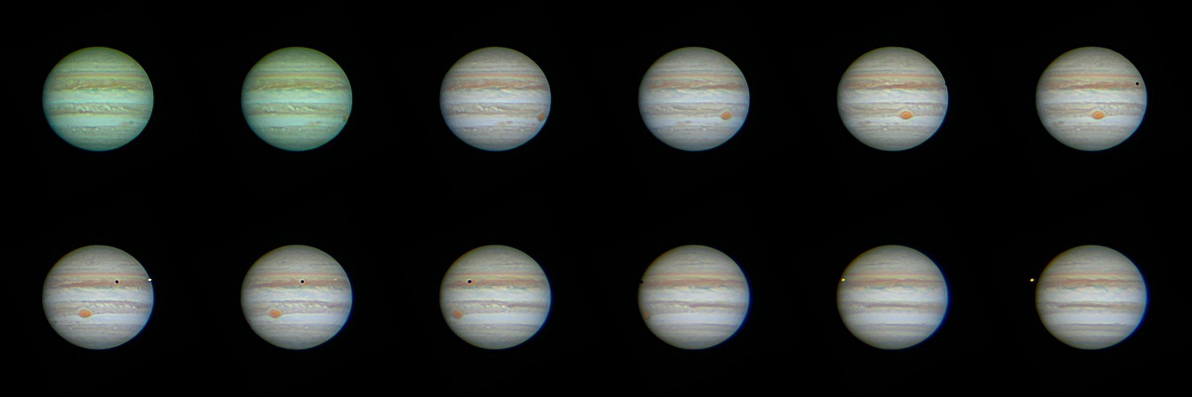 Diese Aufnahmen zeigen den Planeten Jupiter am 2.3.2017 zu den Beobachtungszeiten (von links oben nach rechts unten): 05:00, 05:27, 05:43, 06:23, 07:02, 07:15, 07:51, 08:07, 08:44, 09:13, 09:54 und 10:06 Uhr UT. In dieser Bildsequenz ist der Durchzug des Mondes Io und dessen Schattenwurf auf den Gasriesen zu erkennen.