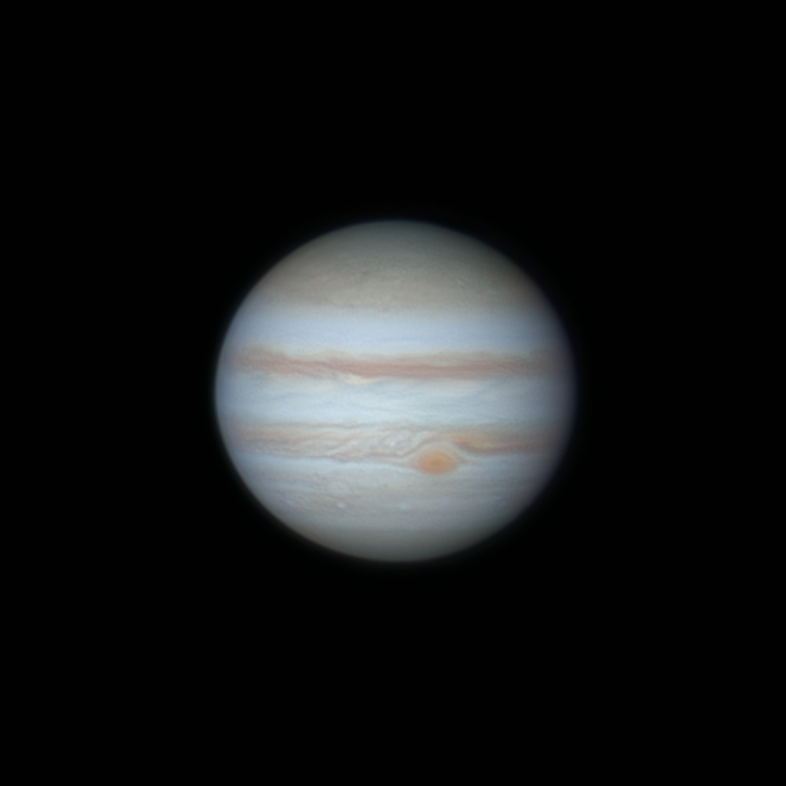 Selten hatte ich bei einer visuellen Beobachtung des Jupiters eine solche Fülle von Details im Okular, wie am 2. September 2023. Deshalb musste auch noch schnell eine Aufnahme am 180-mm-Refraktor gemacht werden. Das Seeing war so gut, dass die Brennweite auf ca. 3700 mm gesteigert werden konnte. Nicht nur der Große Rote Fleck konnte in seinen Details abgebildet werden. Auch das Oval B zeigte Strukturen in seinem Inneren. Viele Wolkenkräuselungen in den Äquatorbändern sind zu erkennen.