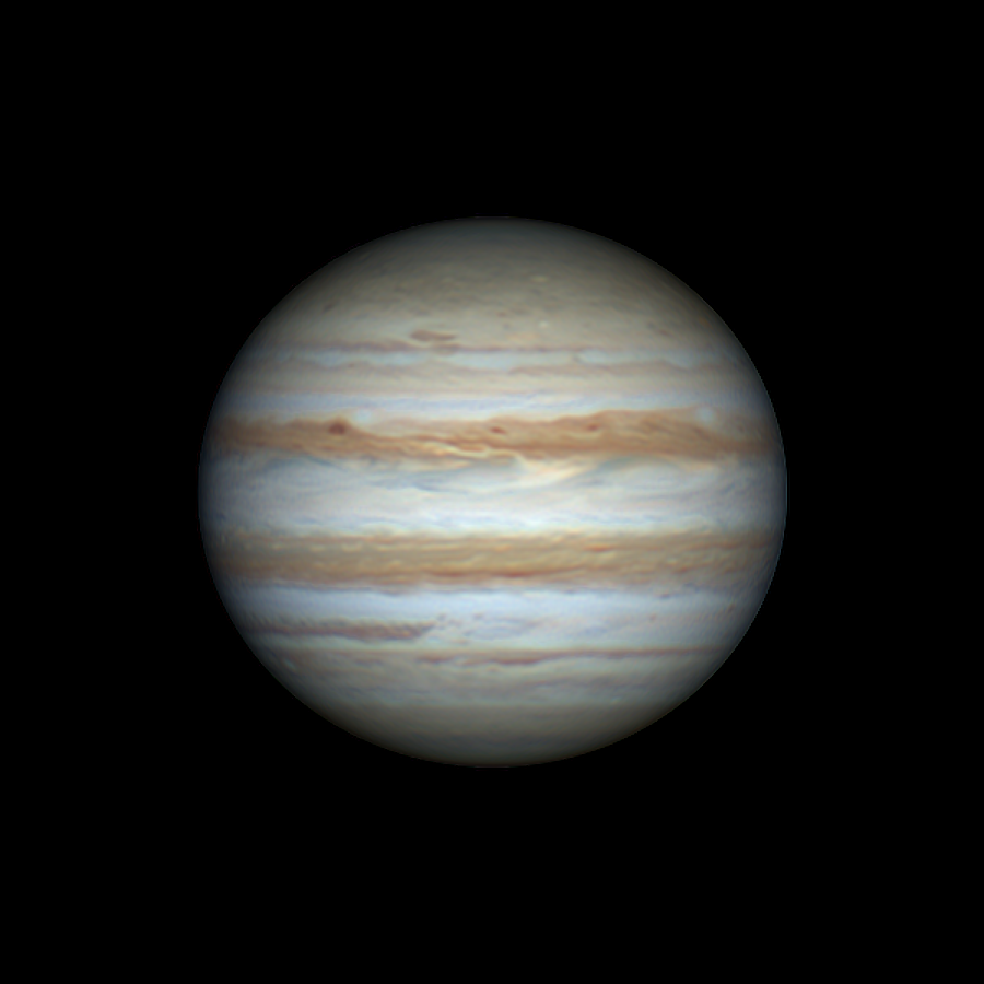 Am 21. Januar 2026 war das Seeing deutlich besser als in den ebenfalls klaren Nächten davor und danach. So konnten von Jupiter zwischen 18:25 bis 21:05 Uhr eine größere Anzahl von Aufnahmen gemacht werden. Letztlich wurden 52 Videos mit einer Länge von jeweils 90 Sekunden mittels Autostakkert bei einer Verwendungsrate von 15 Prozent gestackt. Die entstandenen Bilder wurden zunächst mit Astrosurface nachgeschärft und mit Winjupos derotiert und zu einem Bild verrechnet. Das finale Bild wurde nochmal mit Gimp etwas nachgeschärft. Es ist das erste Mal seit meinem Wechsel zu Celestron C9,25 dass ich das Auflösungspotenzial des Teleskops einigermaßen ausnutzen konnte.