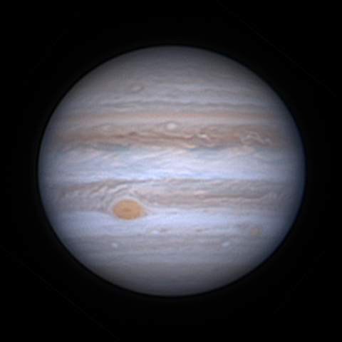 Wolken und unruhige Atmosphäre verhinderten bisher gute Jupiteraufnahmen in der diesjährigen Sichtbarkeitsphase. Die Nacht vom 27. auf den 28. März ließ erstmals eine detailreiche Aufnahme zu. Der Große Rote Fleck zeigt feine Strukturen, ihm folgen viele Verwirbelungen im SEB (Südliches Equatoriales Band). Rechts ist noch der "Kleine Rote Fleck" (Oval BA) zu erkennen. In der Äquatorialzone bilden sich viele Wolkengirlanden und über das NEB (Nördliche Equatoriale Band) hinaus sind Details bis in die polaren Breiten abgebildet.
