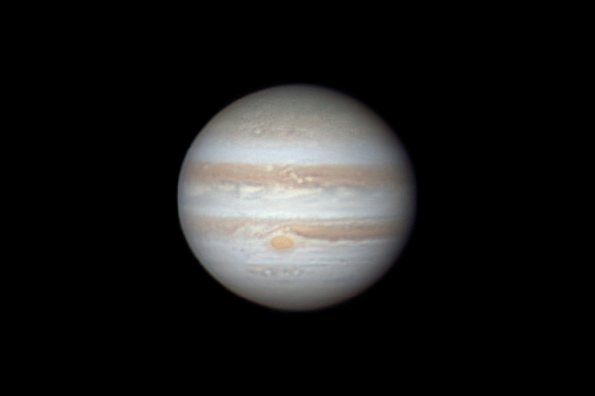 Am 5.9.2024 ergaben sich für mich sehr gute Bedingungen, um Jupiter zu beobachten. Visuell sah ich an den Monden Kallisto und Ganymed deutliche Strukturen. Die beobachtbaren Wolkenstrukturen auf Jupiter waren sehr komplex und gerade der Große Rote Fleck mit fassbaren Einzelheiten zog in den Bann. Schweren Herzens entschied ich mich zu einer Aufnahme mit der Kamera. Von den Videosequenzen waren die ersten drei brauchbar, bevor hohe Bewölkung den Planeten in »Wolken-Milch« tauchte.