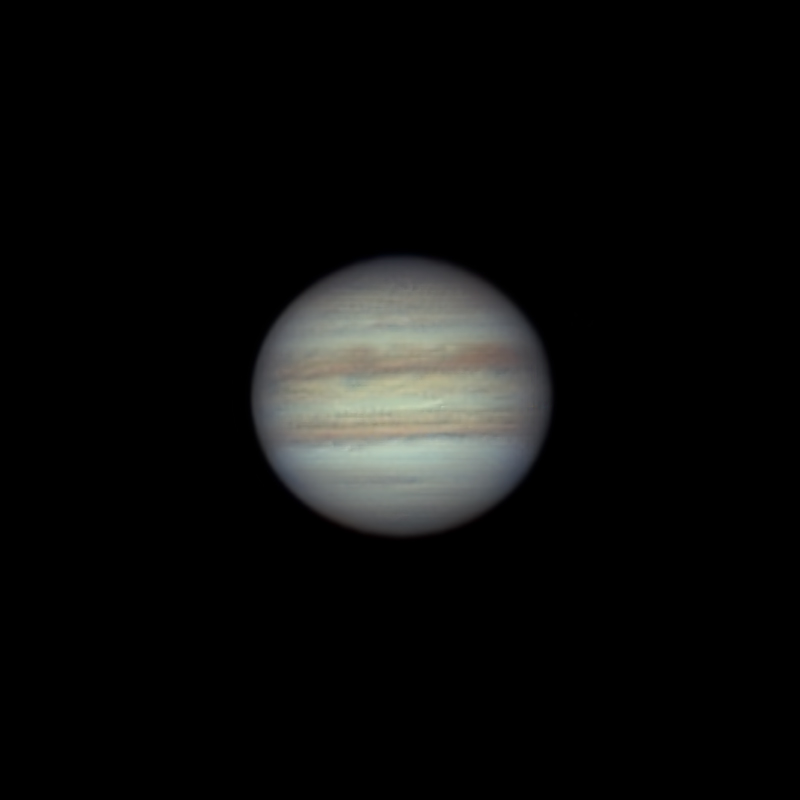 Längere Zeit mussten wir in Franken auf gutes Seeing warten. Am Abend des 5. August 2020 war einigermaßen gute Bedingungen, um Jupiter abzubilden. Leider fehlte in dieser Nacht der Große Rote Fleck als Verzierung des Bilds. Dennoch zeigte der eingesetzte 135-mm-Refraktor seine hervorragende Abbildungsqualität.