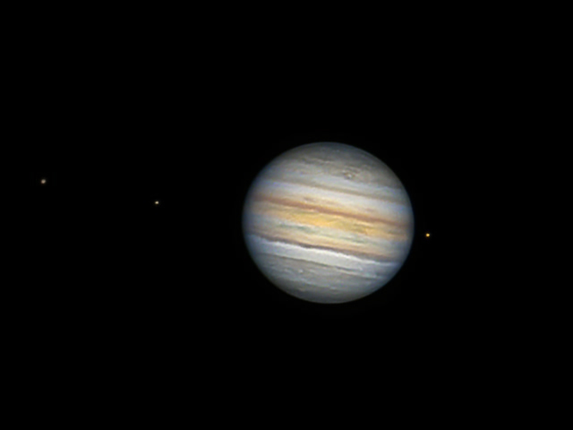 Jupiter mit seinen Monden Ganymed, Europa und Io, von links nach rechts. Leider war der Große Rote Fleck in dieser tollen Nacht nicht zu sehen.