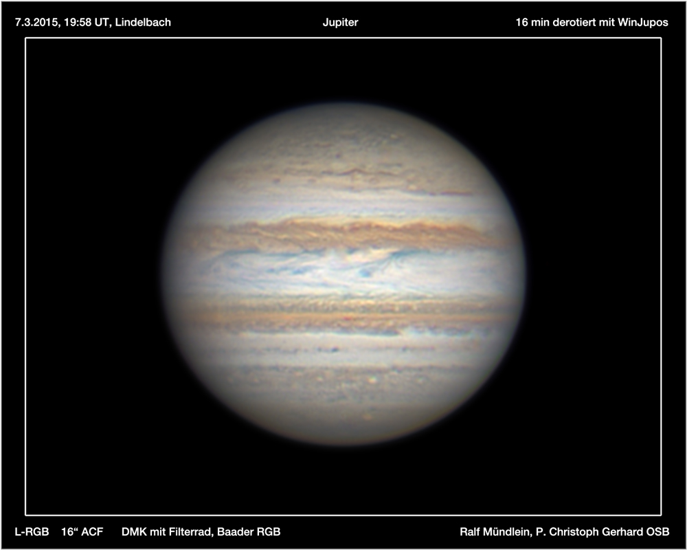 Nach geduldigem Warten kam am 7.3.2015 die Gelegenheit, um den Gasriesen ins Bild zu setzen. Die erste Aufnahmeserie war die beste von allen. Darüber hinaus war Jupiter auch im Okular ein Genuss!