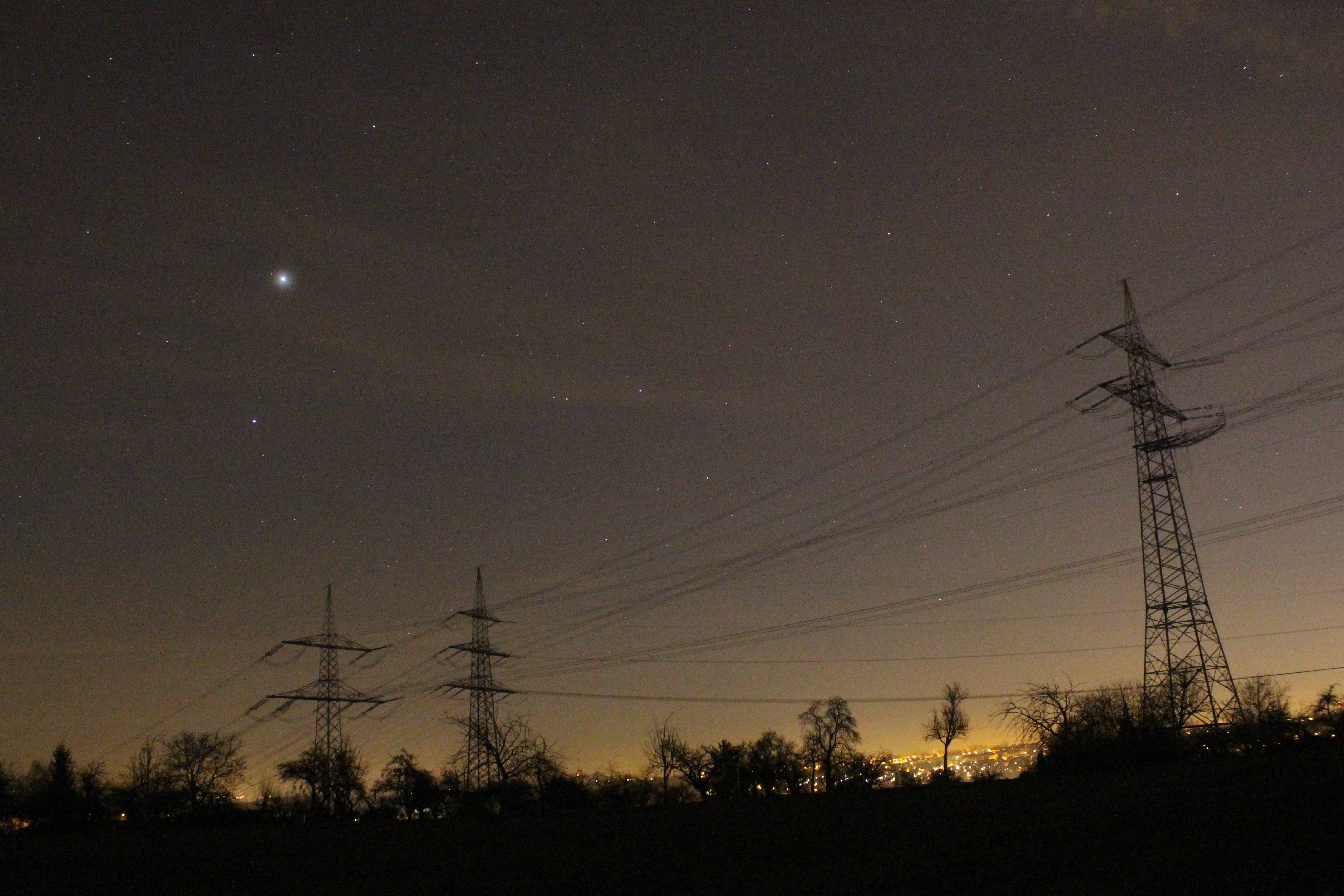 Jupiter im Sternbild Jungfrau, aufgenommn nördlich von Ludwigsburg. Rechts von Spika erkennt man das Sternbild Rabe. Etwas rechts oberhalb von diesen steht das Sternbild Becher.