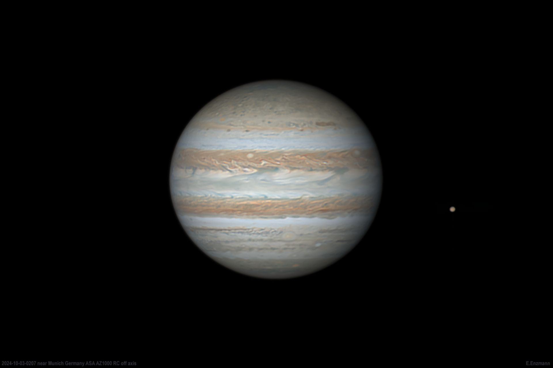 Nach langer Schlechtwetterperiode konnte ich eine Aufnahme von Jupiter von Bayern aus machen. Überraschenderweise wurde am 3. Oktober 2024 der Himmel in der Nacht klar. Für das Bild habe ich 40 Aufnahmen à 60 Sekunden verwendet.