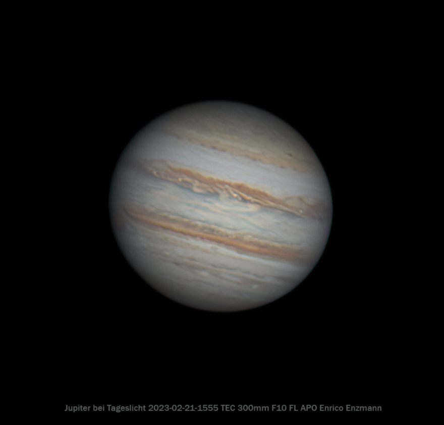 Ich probiere seit geraumer Zeit immer mal wieder, Jupiter am Tageshimmel aufzunehmen. Am 21. Februar 2023 war das Seeing kurz vor 17:00 Uhr Ortszeit mal für rund 15 Minuten ganz gut. Es ist erstaunlich das dieses Bild von Jupiter zu einer Zeit entstand, wo die Sonne noch über sieben Grad hoch am Himmel stand. Auch ist Jupiter zum Zeitpunkt der Aufnahme nur noch 34,5 Bogensekunden groß gewesen. Das Bild hätte noch besser werden können, aber durch ein Missgeschick bei dem so extrem wichtigen genauen Fokussieren sind etliche Bilder leicht unscharf geworden. Trotzdem ist ein ansprechendes Bild von Jupiter bei Tageslicht entstanden.