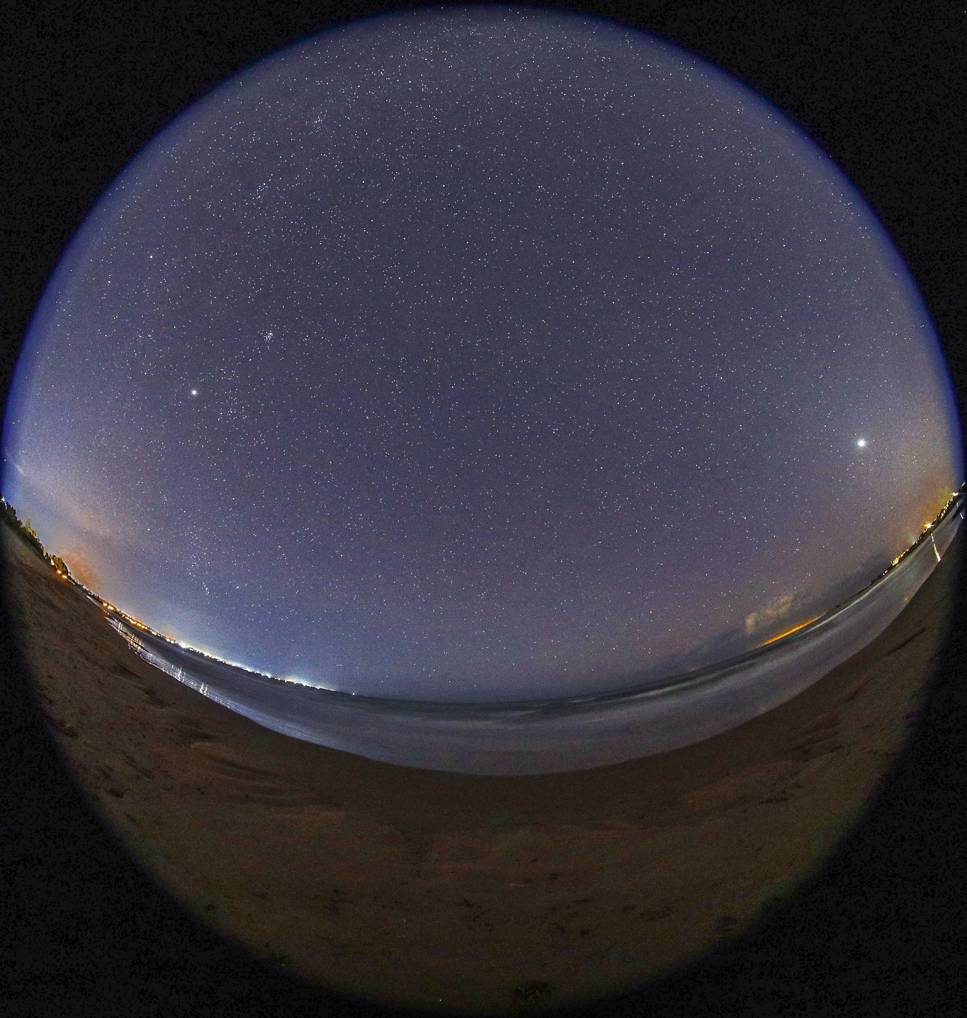 Jupiter rising in the east (left) and Venus setting in the west, reflection on the sea (right). Location: Porto Ulisse Sicily Ispica, Italy