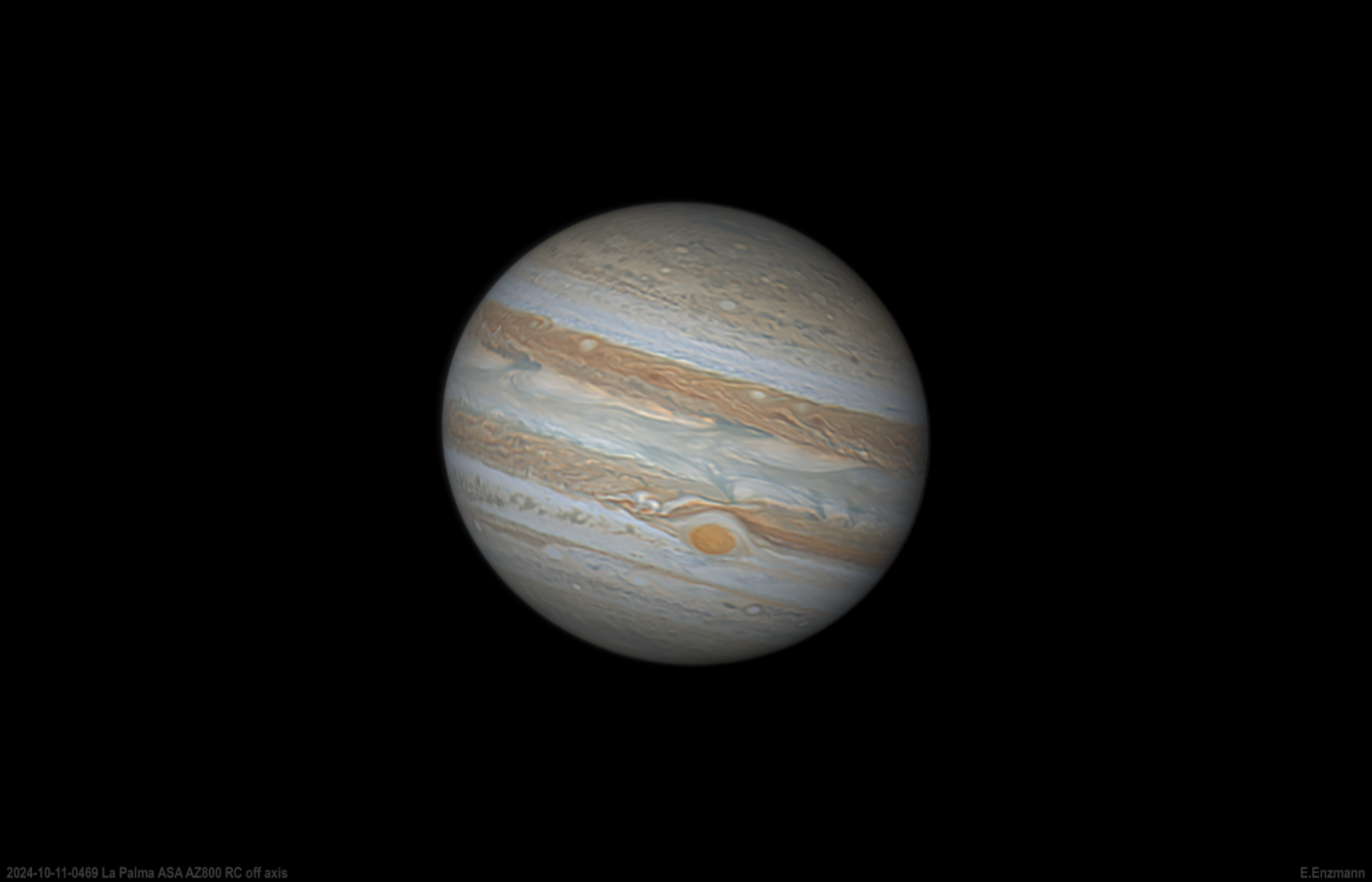 Unter gutem bis sehr guten Seeing ist diese Jupiteraufnahme vom 11. Oktober 2024 in La Palma entstanden. Insgesamt wurden 72 Bilder derotiert jeweils mit einer Minute Belichtungszeit. Das Teleskop wurde off axis mit 25% vom Spiegeldurchmesser dabei betrieben.