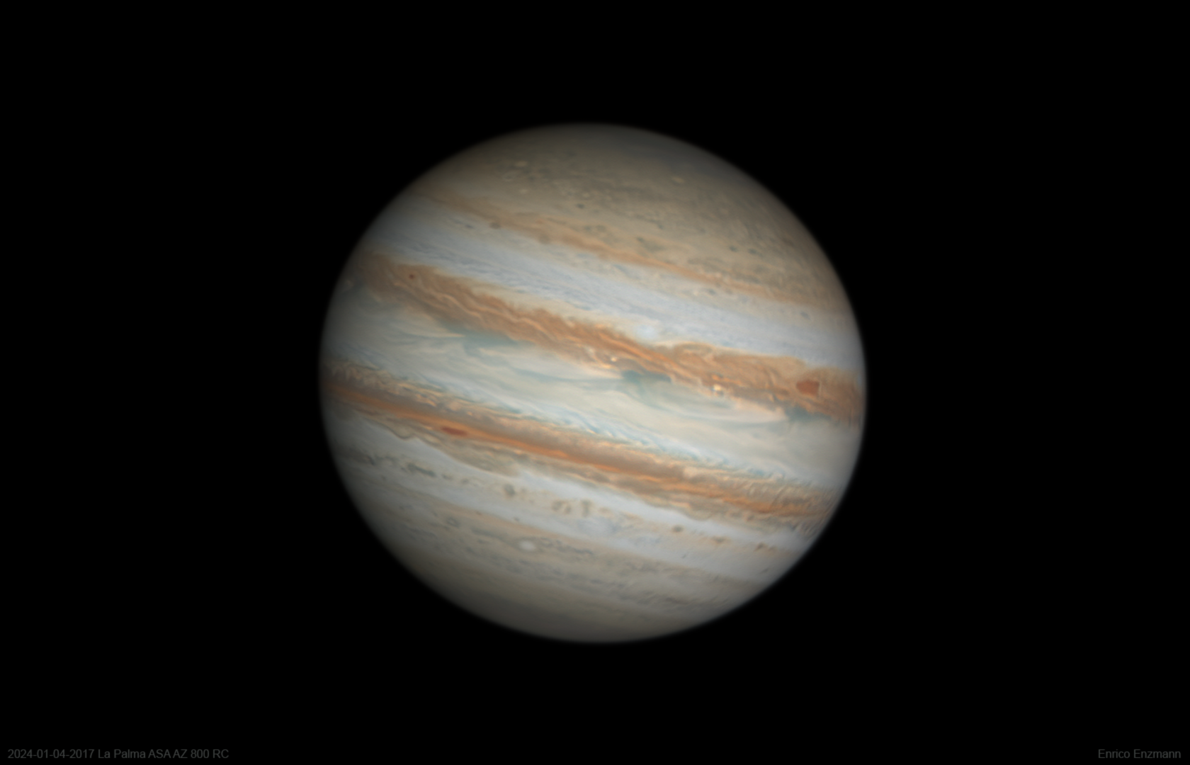 Hier ein Bild, das ebenfalls mit dem verbesserten WinJUPOS Derotations Programm gemacht worden ist. Es handelt sich um eine Aufnahme von 4. Januar 2024 aus La Palma. An diesem Abend war das Seeing längere Zeit gut und durch einen Zufall hatte ich noch einen Datensatz von fast drei Stunden. Daraus habe ich insgesamt 109 Videos mit jeweils 60 Sekunden ausgesucht, die eine Gesamtzeit von sage und schreibe 159 Minuten umfassen. Wie in den letzten Bildern ist auch hier Jupiter bis zum Rand scharf. Aufgrund der vielen Bilder musst so gut wie kein Rauschfilter eingesetzt werden. Eine wirklich starke Verbesserung, welche durch die neue Version von WinJUPOS ermöglicht wird.