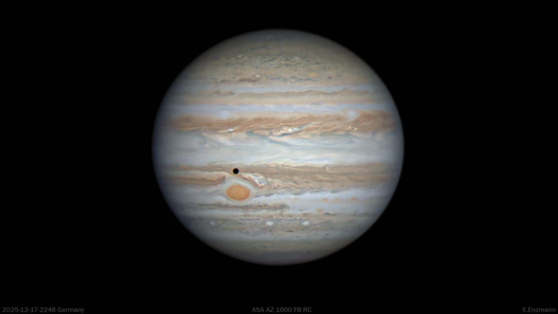 Dieses Bild von Jupiter wurde am 17. Dezember 2025 mit dem ASA AZ 1000 F8 RC Teleskop südlich von München aufgenommen. Für diese Aufnahme wurde aber nur ein seitlicher (off-axis) Teil der Optik mit 335 mm Durchmesser genutzt. Das fertige Bild stammt nicht aus einem einzigen Foto, sondern wurde aus einem einzigen Video von sechs Minuten Länge erstellt. Wegen des guten Seeings konnten etwa 60 Prozent der Videobilder zum »stacken« verwendet werden – das ist ein außergewöhnlich hoher Wert. Es wurde kein Derotations-Programm verwendet.