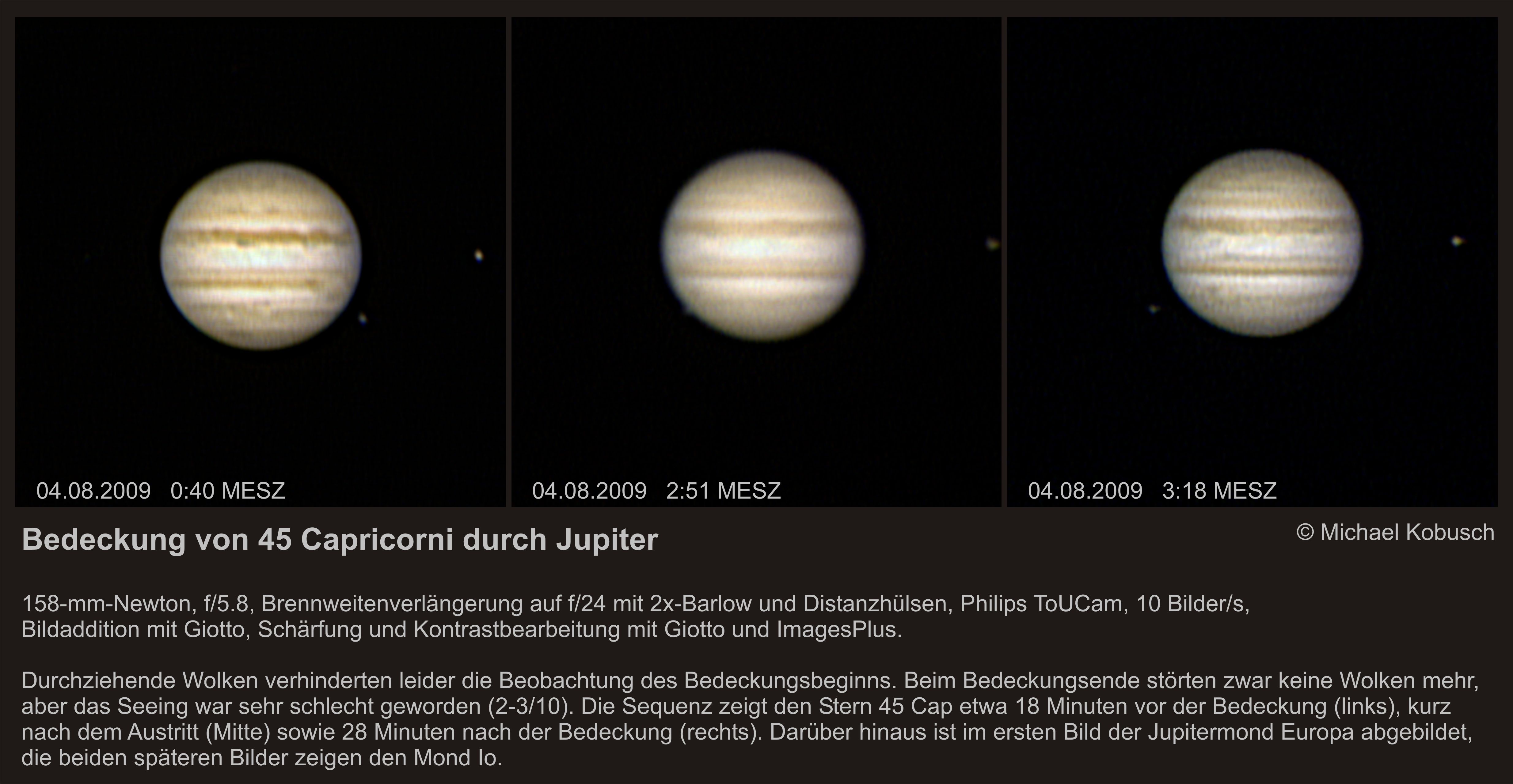 Die Sequenz zeigt den Stern 45 Cap etwa 18 Minuten vor der Bedeckung (links), kurz nach dem Austritt (Mitte) sowie 28 Minuten nach der Bedeckung (rechts). Darüber hinaus ist im ersten Bild der Jupitermond Europa abgebildet, die beiden späteren Bilder zeigen den Mond Io.