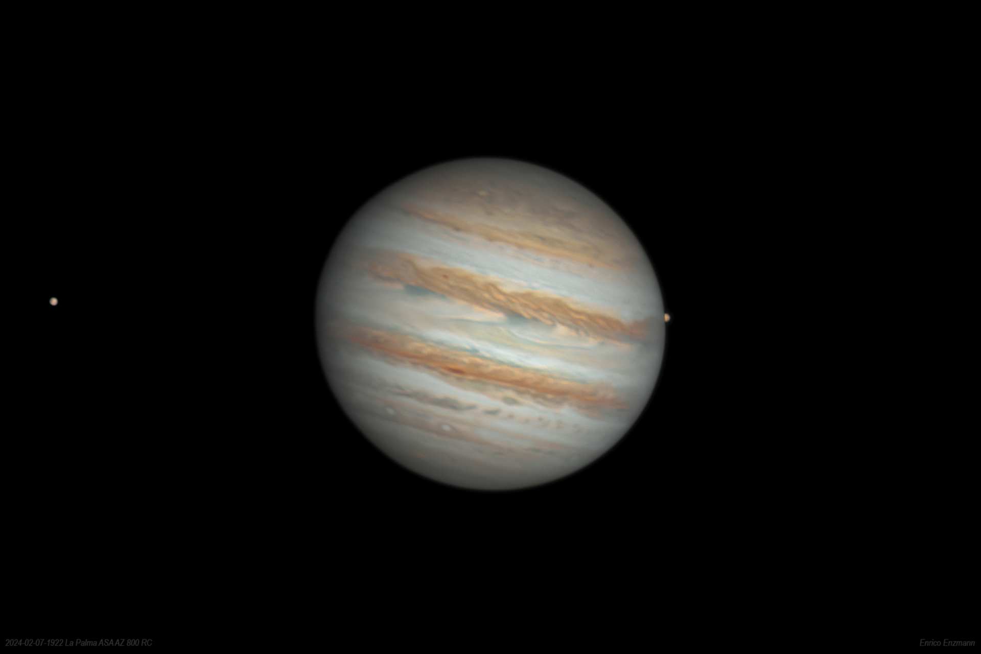 Gerade zur rechten Zeit wurde das Seeing in La Palma am 7. Februar 2024 etwas besser und hat diese Aufnahme ermöglicht. Sie zeigt Jupiter, der gerade den Mond Io etwa halb verdeckt, und links den Mond Europa.