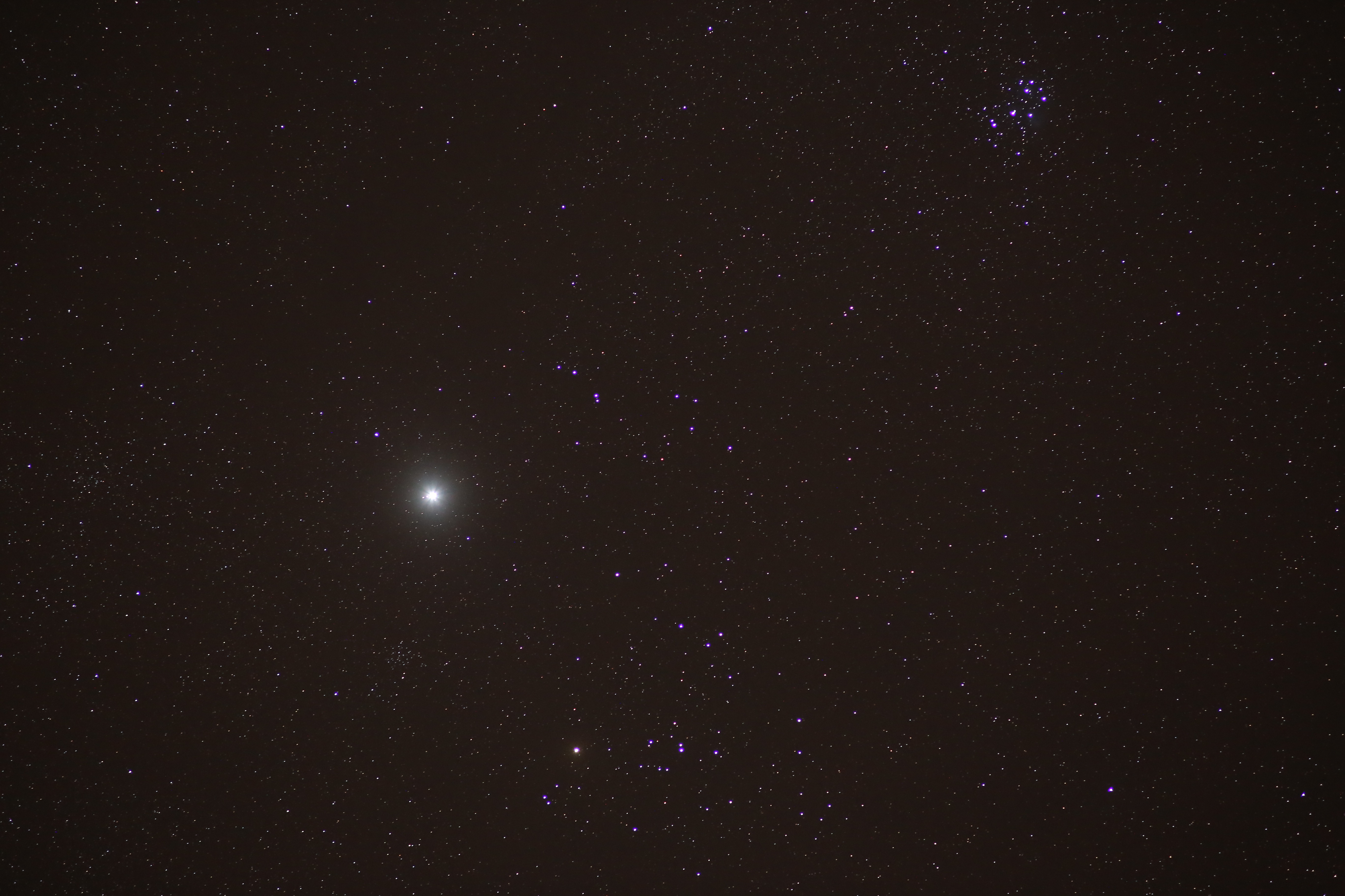 Jupiter hält sich derzeit im Sternbild Stier auf und bietet in unseren Breiten sehr gute Beobachtungsbedingungen hoch über unserem Kopf. Zusammen mit dem Stierkopf und Aldebaran als Hauptstern bildet er ein schönes Fotomotiv mit dem Sternhaufen der Plejaden.