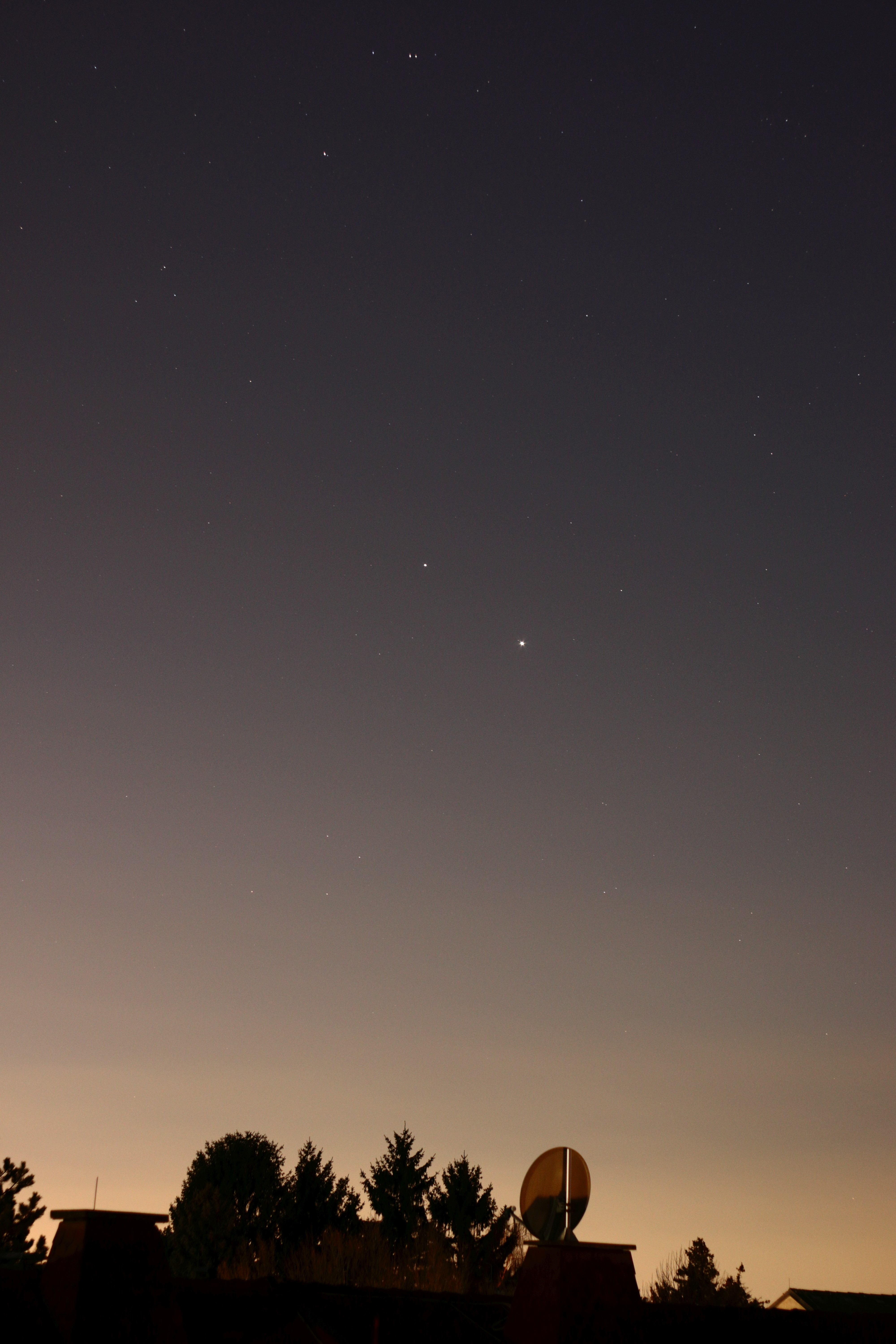 Jupiter und Saturn sind wieder ein Stück "zusammengerutscht", ihr Abstand ist nur noch eine Daumenbreite in der Weite des ausgestreckten Arms (rund zwei Grad). Der Doppelstern am oberen Bildrand ist Alpha Capricorni im Kopf des Sternbilds Steinbock.