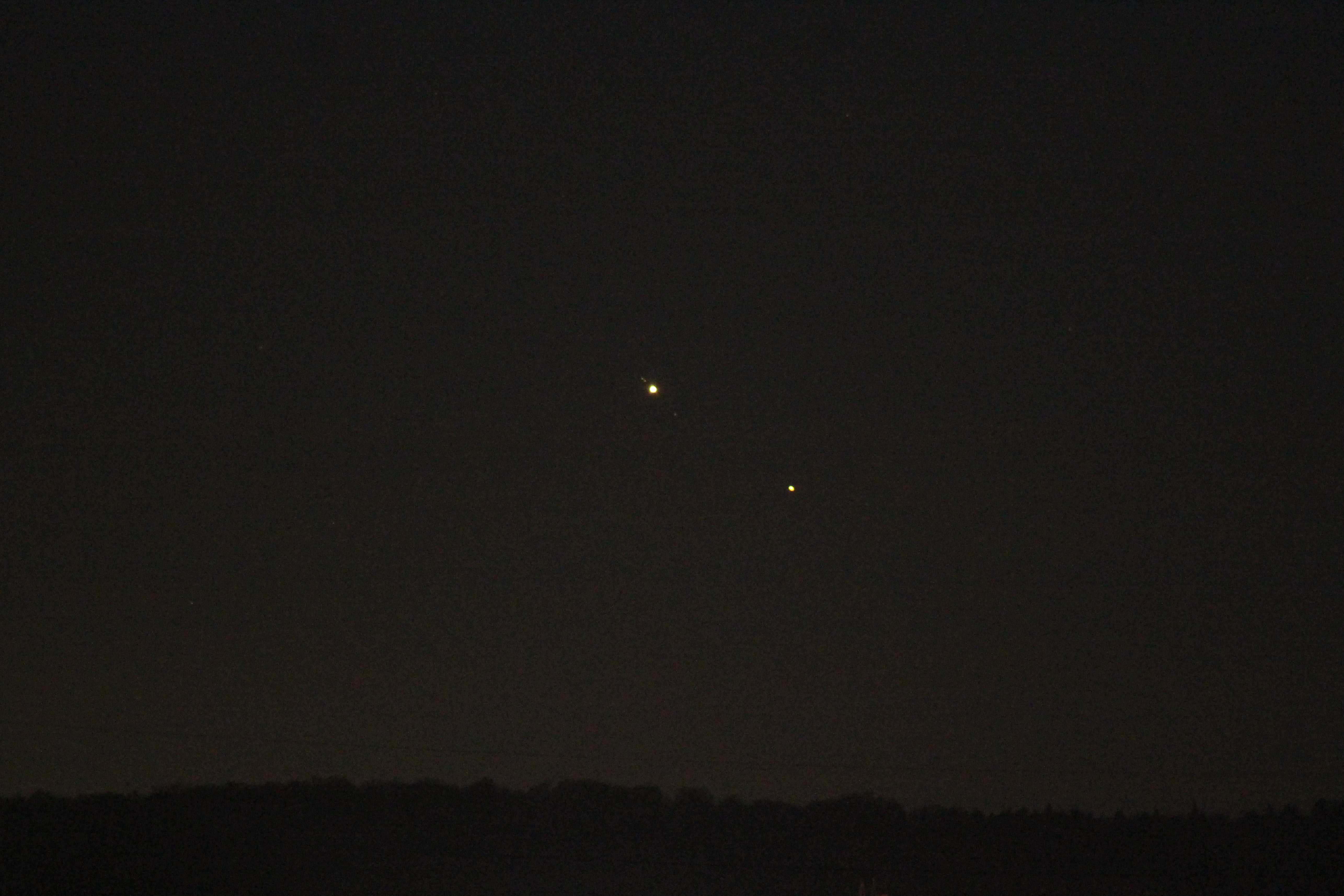 Erst fünf Tage nach der Großen Konjunktion gab der Himmel wieder den Blick auf die beiden größten Planeten unseres Sonnensystems frei, und so konnte ich am Abend des 2. Weihnachtsfeiertages beide Planeten in der fortgeschrittenen Abenddämmerung westlich von Nufringen fotografieren.