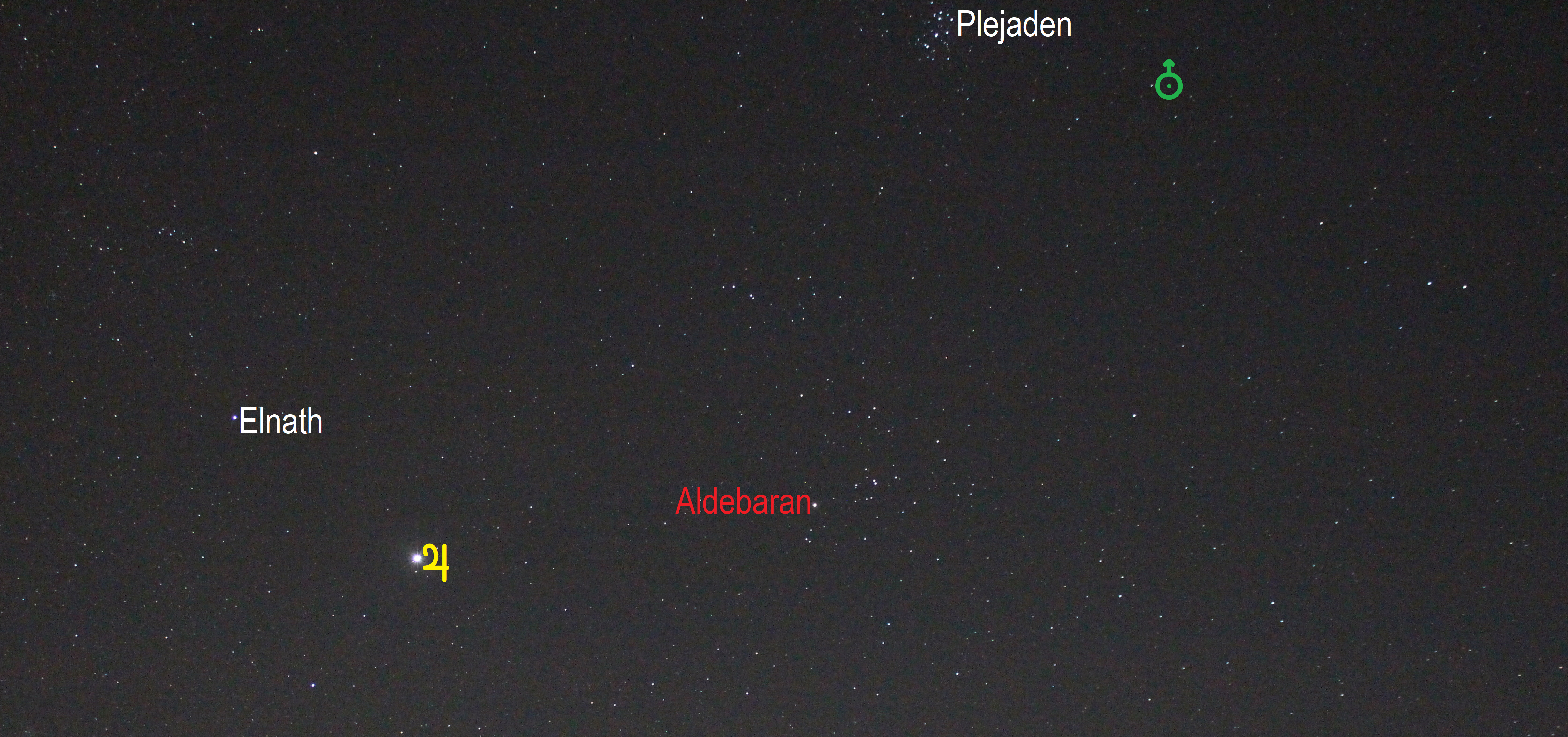 Leserbilder Astronomie: Jupiter im Sternbild Stier (Objekte beschriftet)