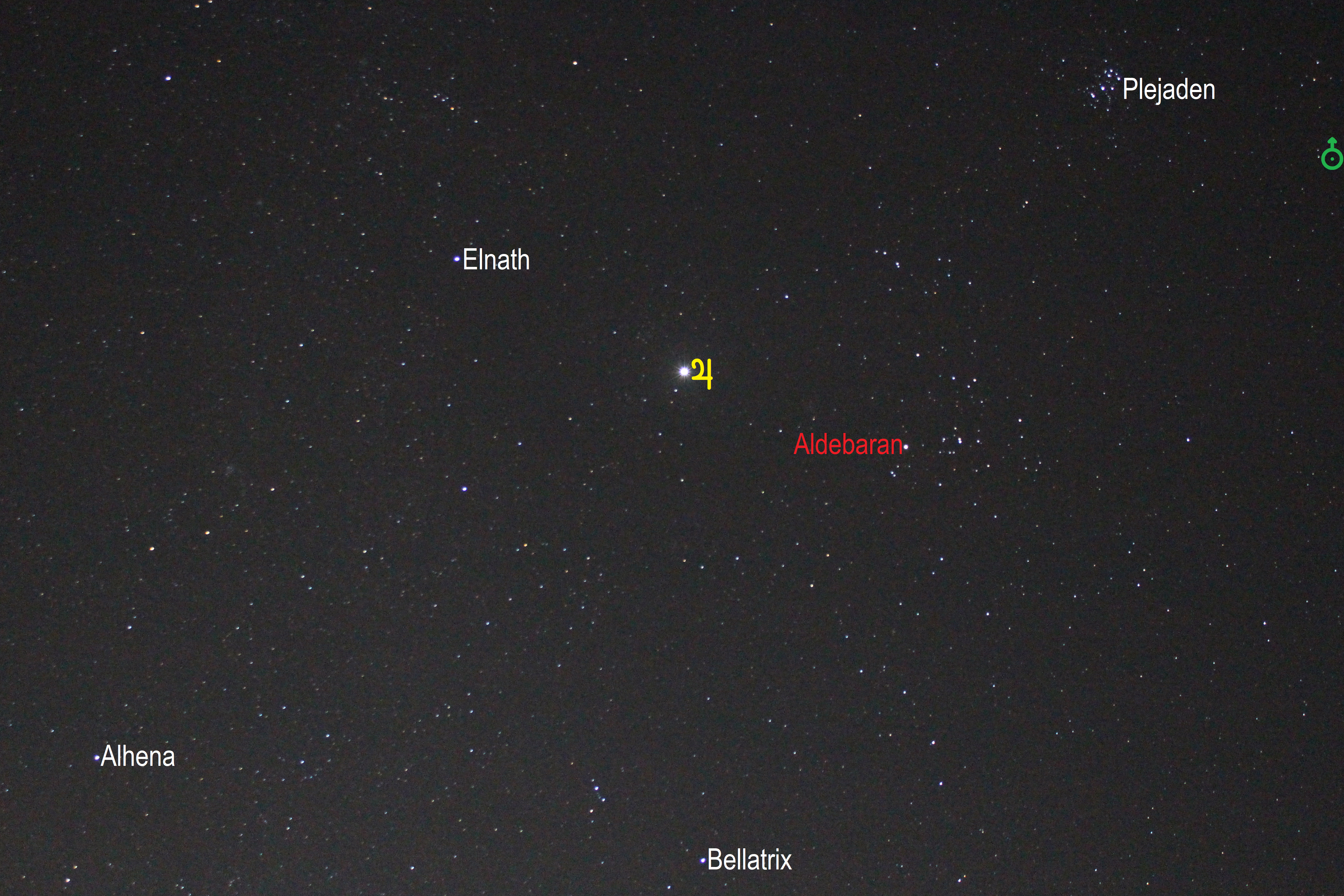 Leserbilder Astronomie: Jupiter im Sternbild Stier (Objekte beschriftet)