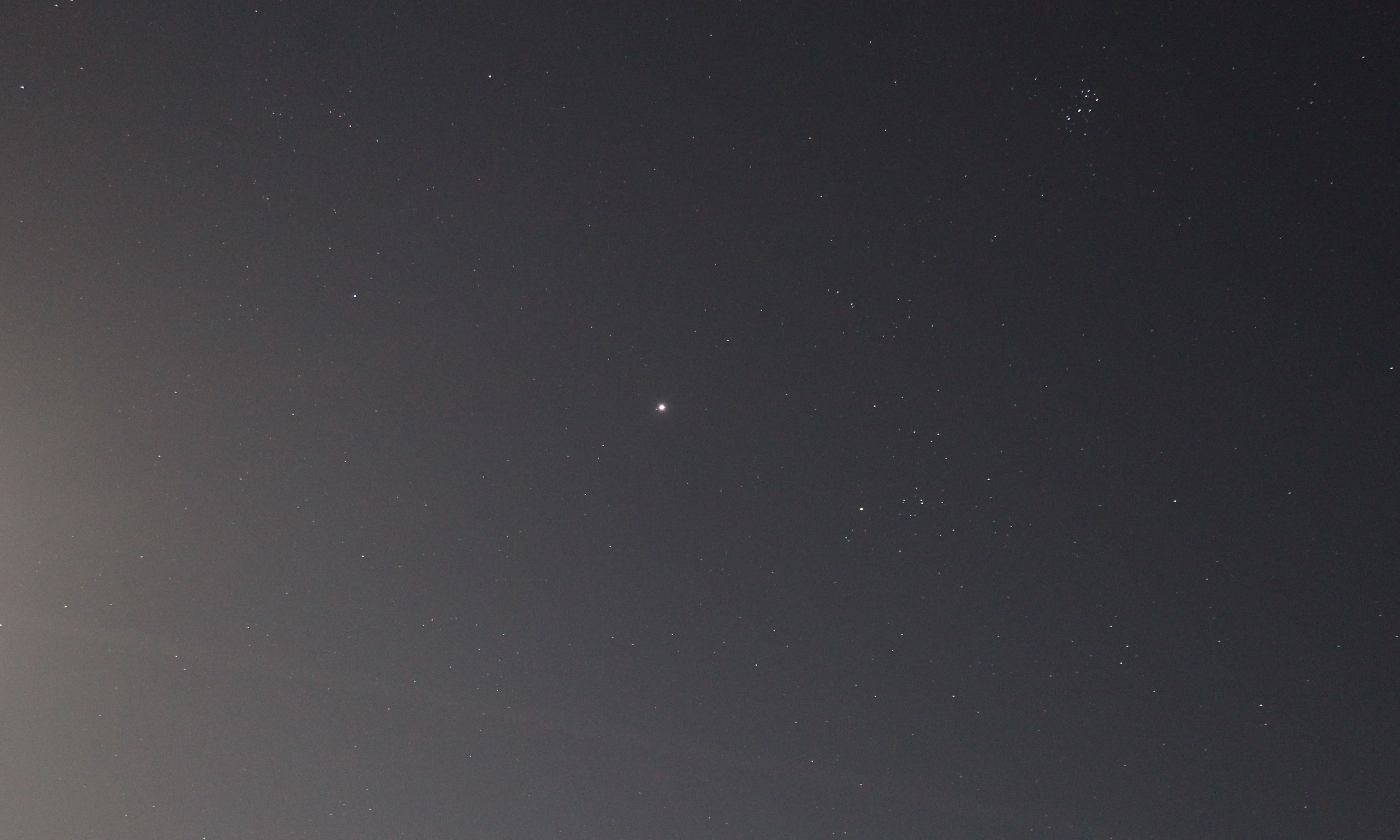 Jupiter am Abendhimmel im Sternbild Stier, aufgenommen westlich des Sindelfinger Ortsteils Maichingen.