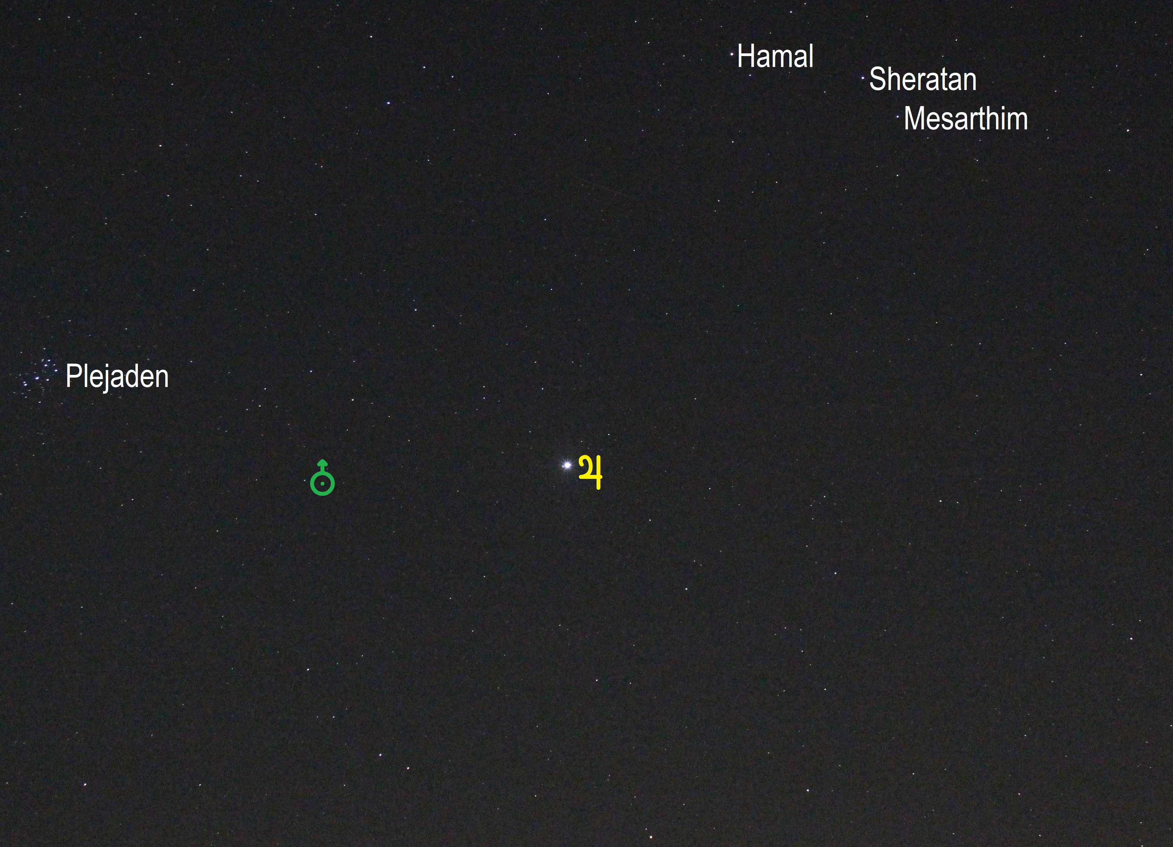 Leserbilder Astronomie: Jupiter im Sternbild Widder (Objekte beschriftet)