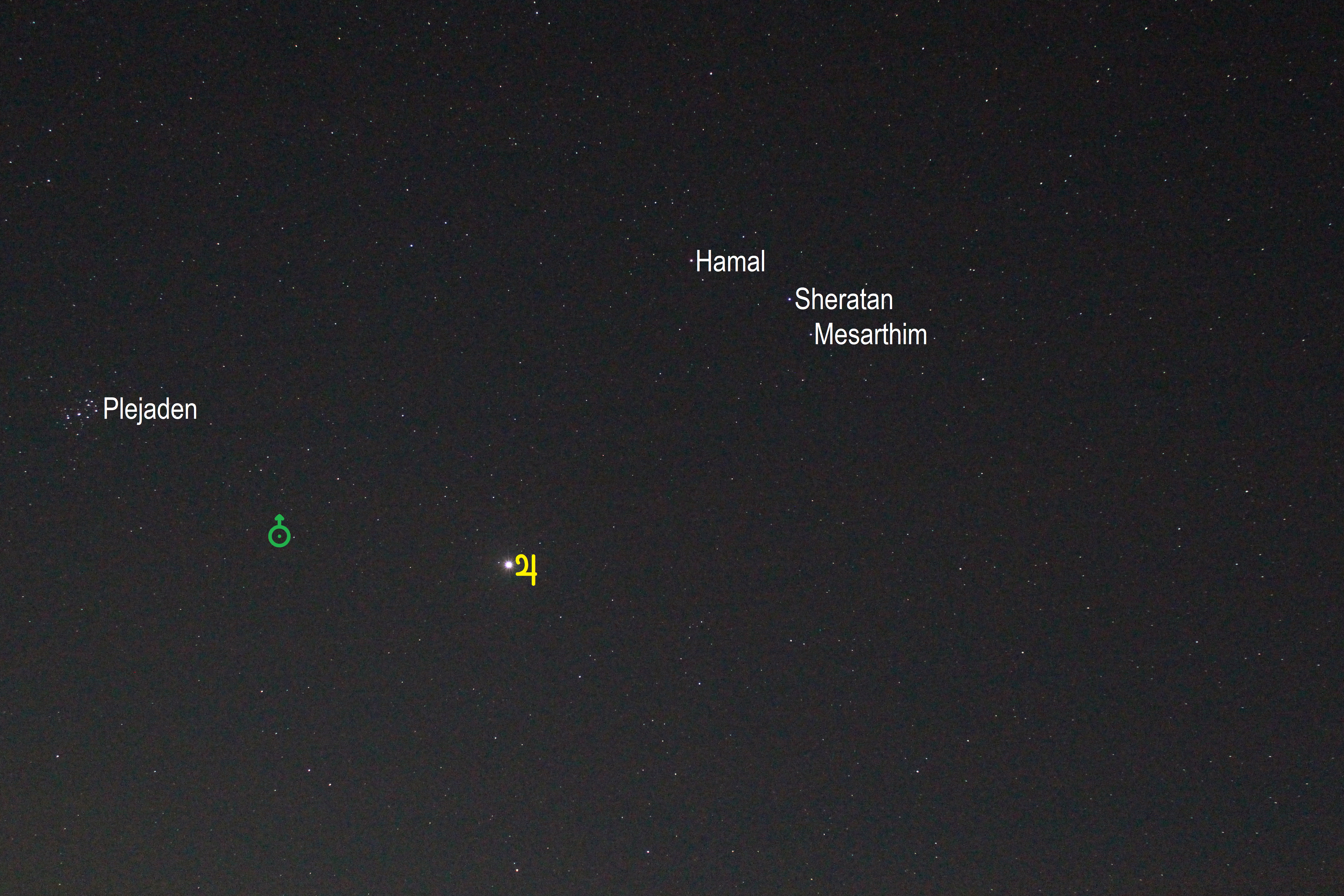 Leserbilder Astronomie: Jupiter im Sternbild Widder (Objekte beschriftet)