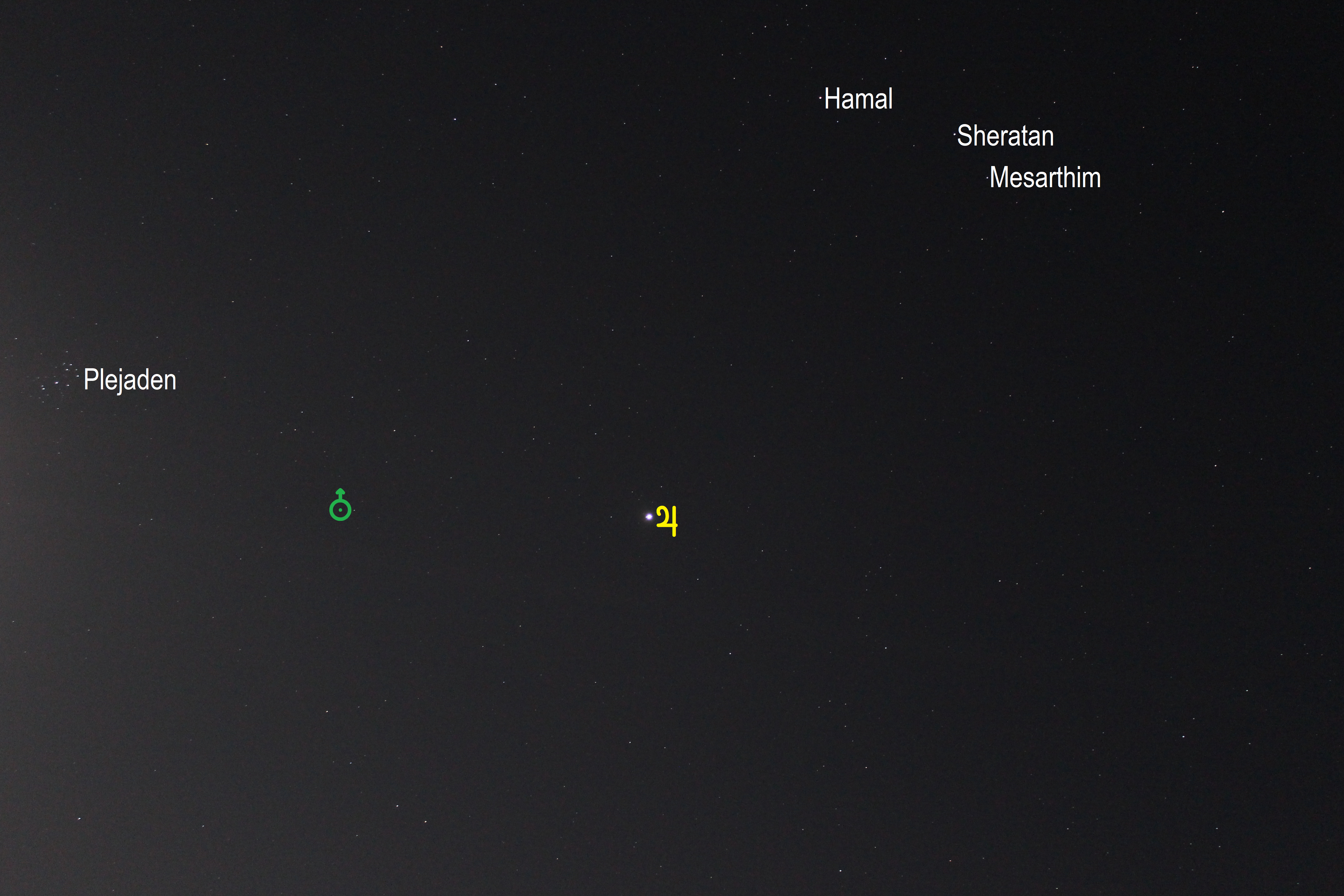 Leserbilder Astronomie: Jupiter im Sternbild Widder (Objekte beschriftet)