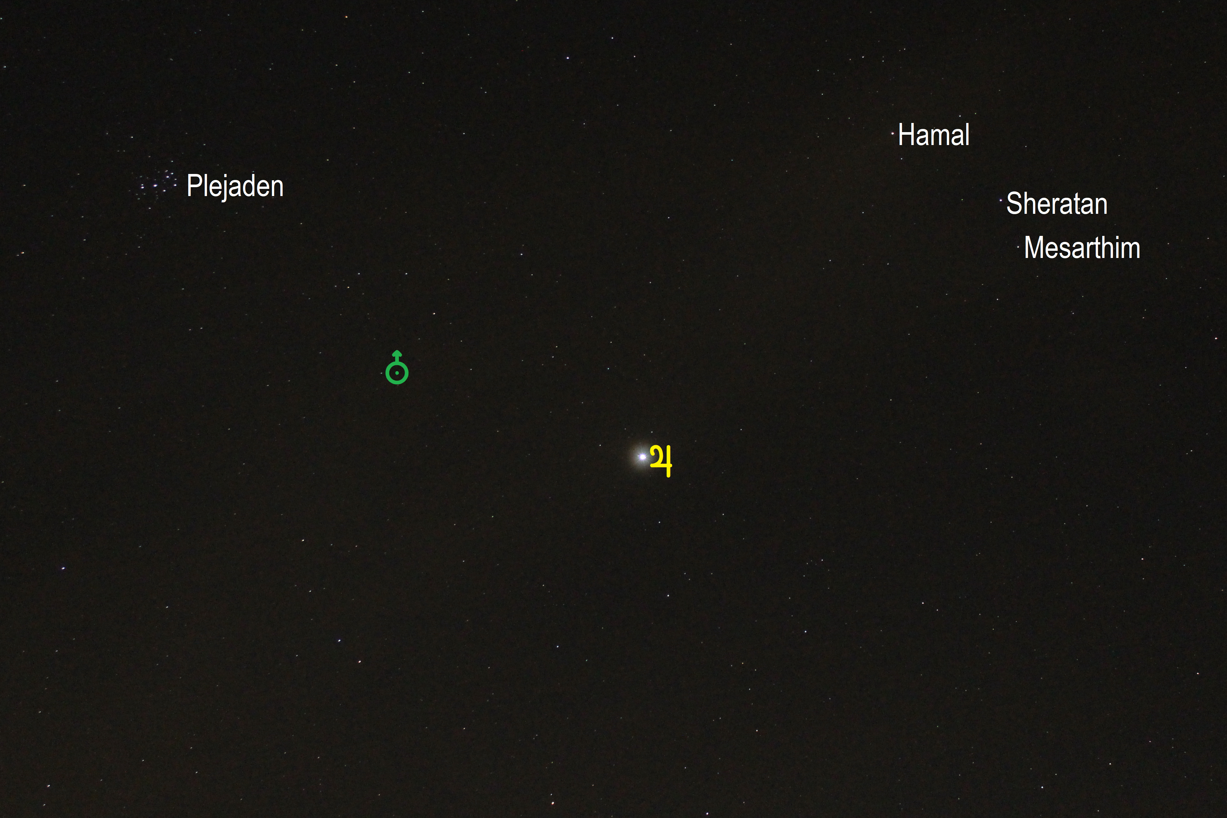 Leserbilder Astronomie: Jupiter im Sternbild Widder (Objekte beschriftet)