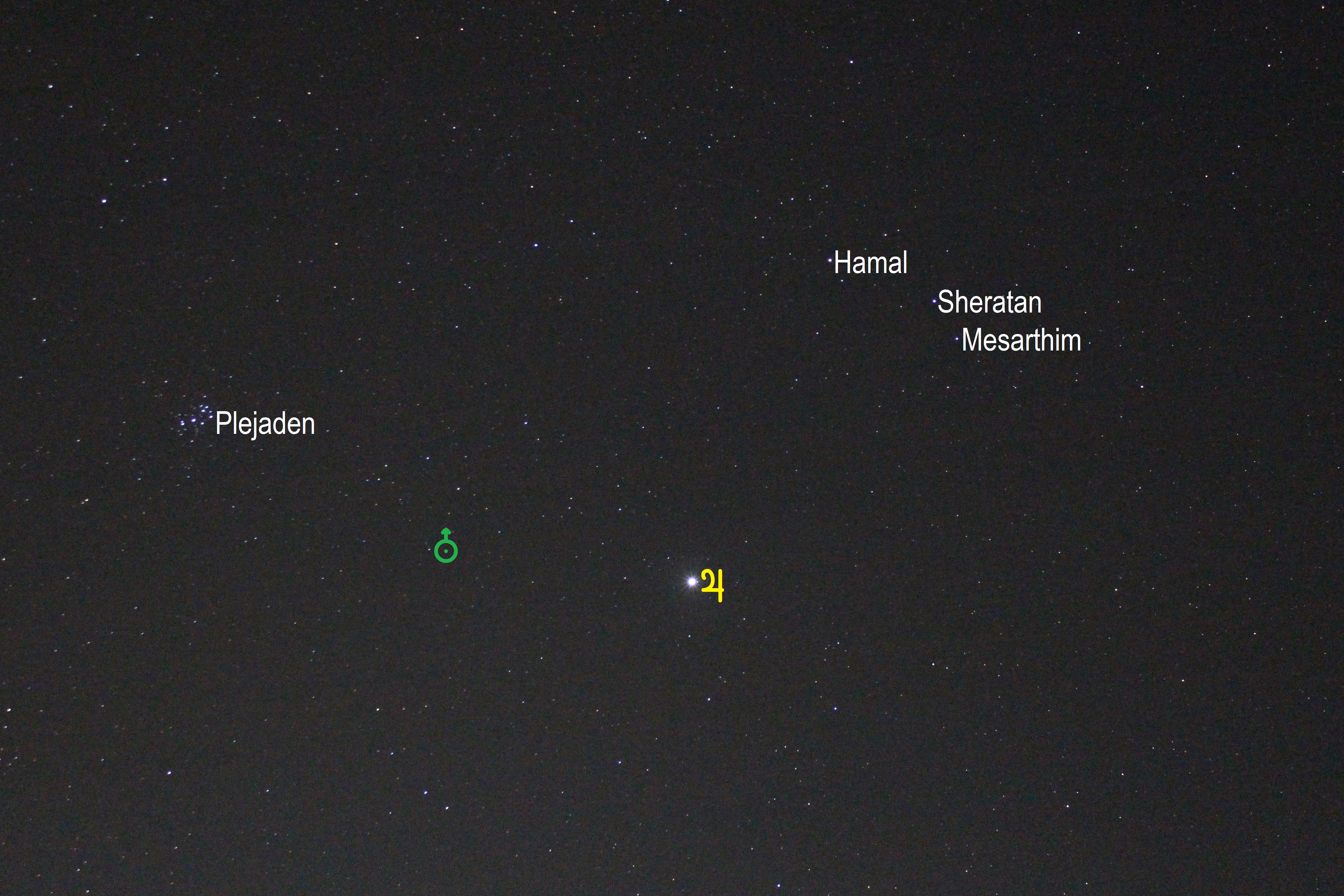 Leserbilder Astronomie: Jupiter im Sternbild Widder (Objekte beschriftet)