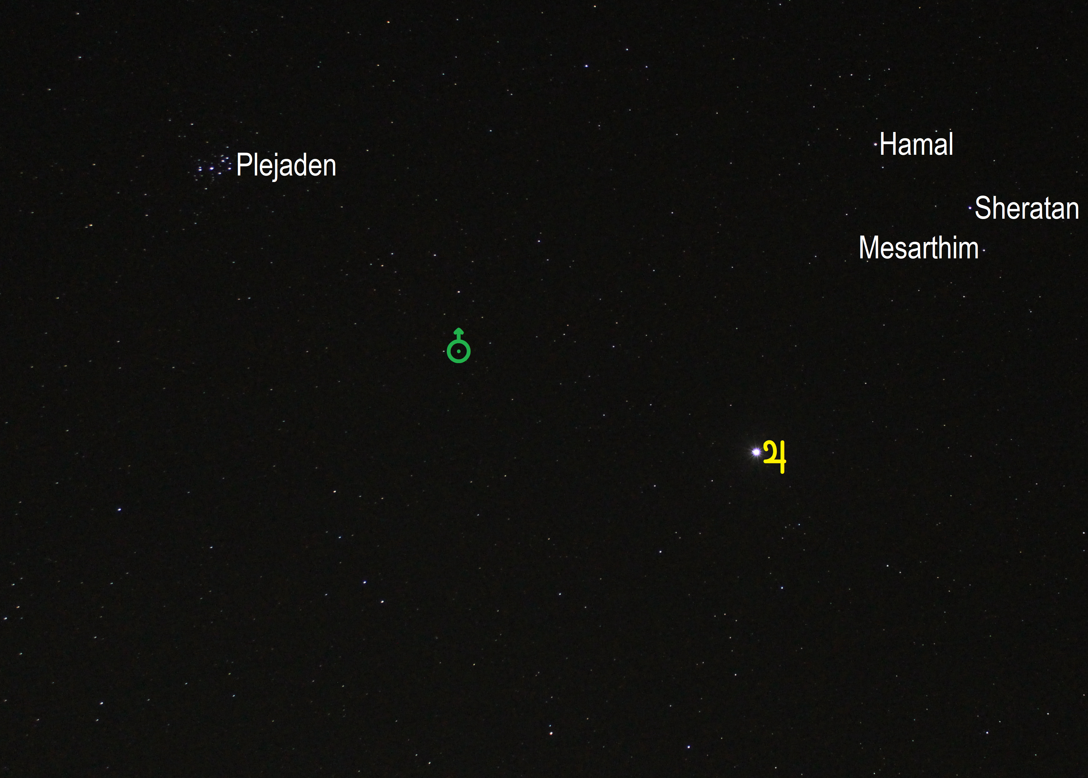 Leserbilder Astronomie: Jupiter im Sternbild Widder (Objekte beschriftet)