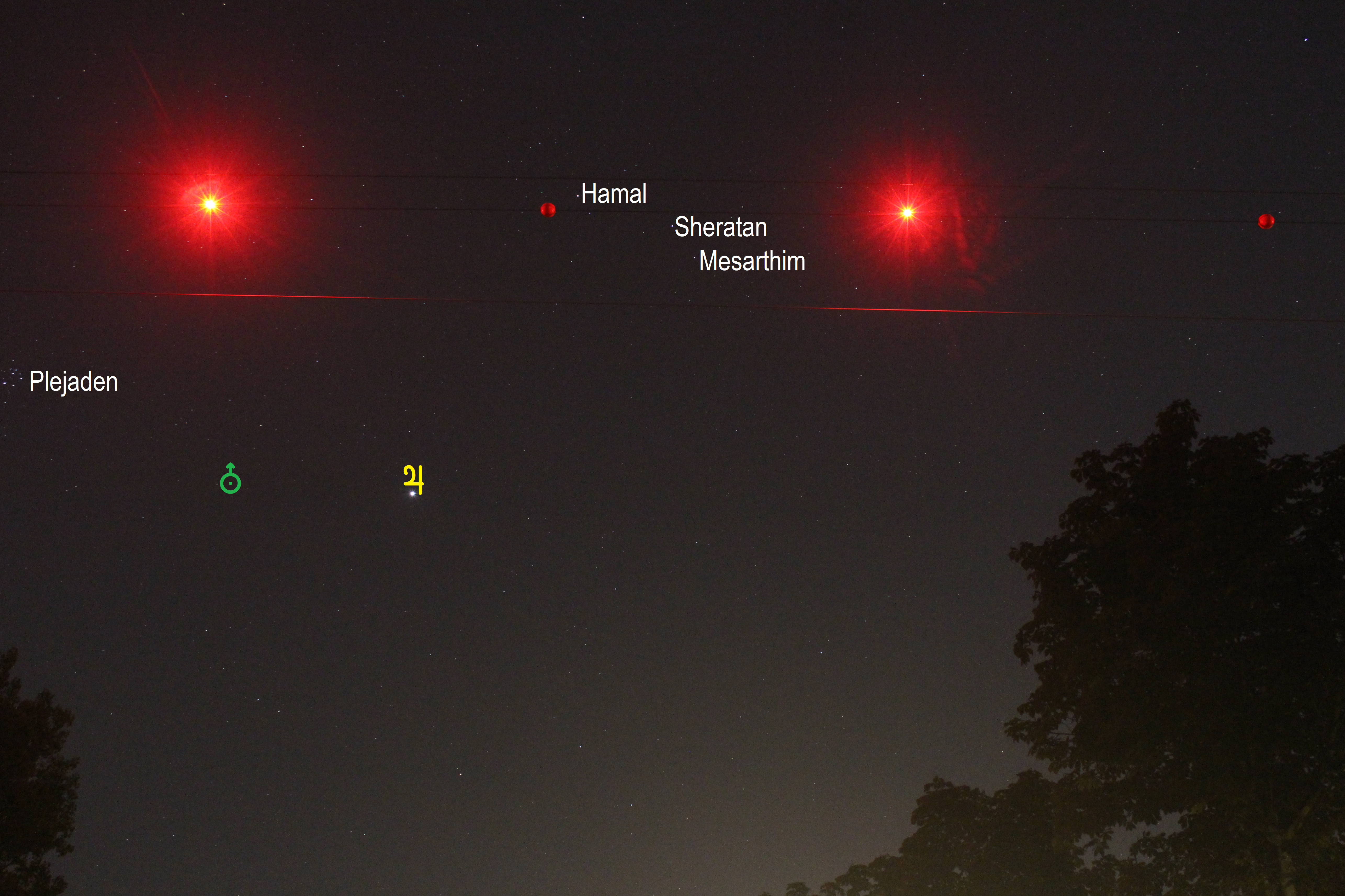 Leserbilder Astronomie: Jupiter im Sternbild Widder vor der höchsten Lichterkette Deutschlands (Objekte beschriftet)