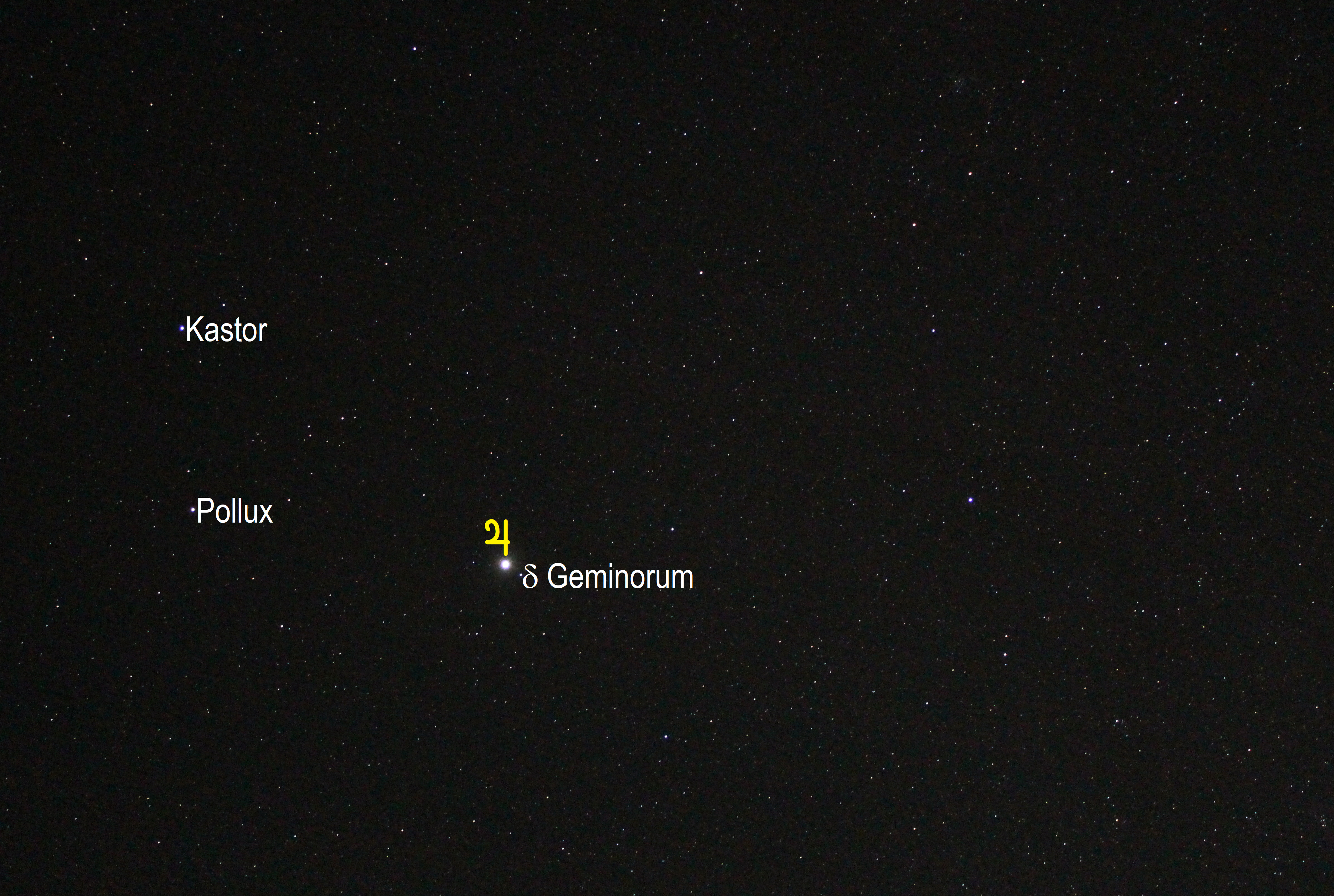 Jupiter im Sternbild Zwillinge, nahe des Sterns δ Geminorum