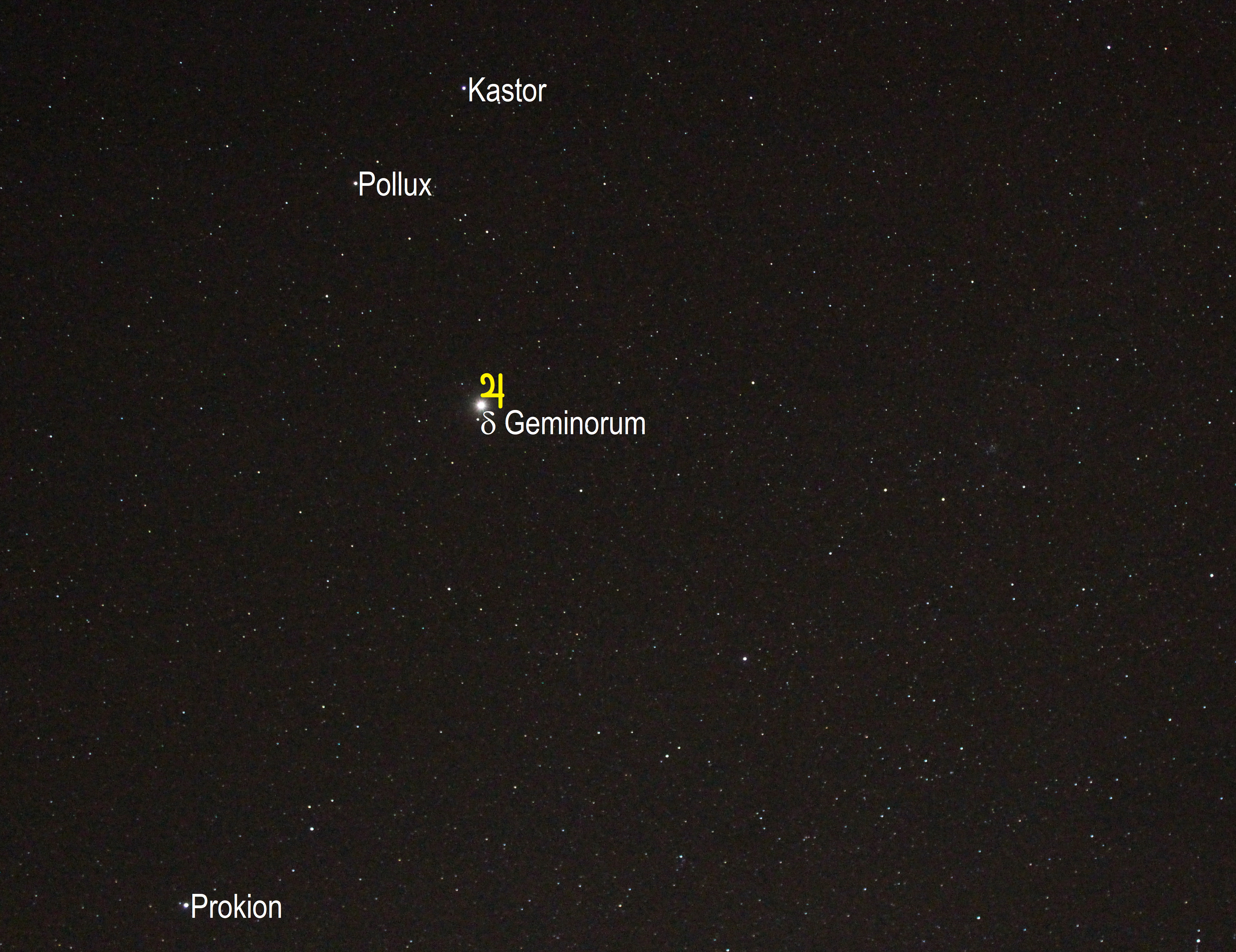 Jupiter im Sternbild Zwillinge, nahe Delta Geminorum