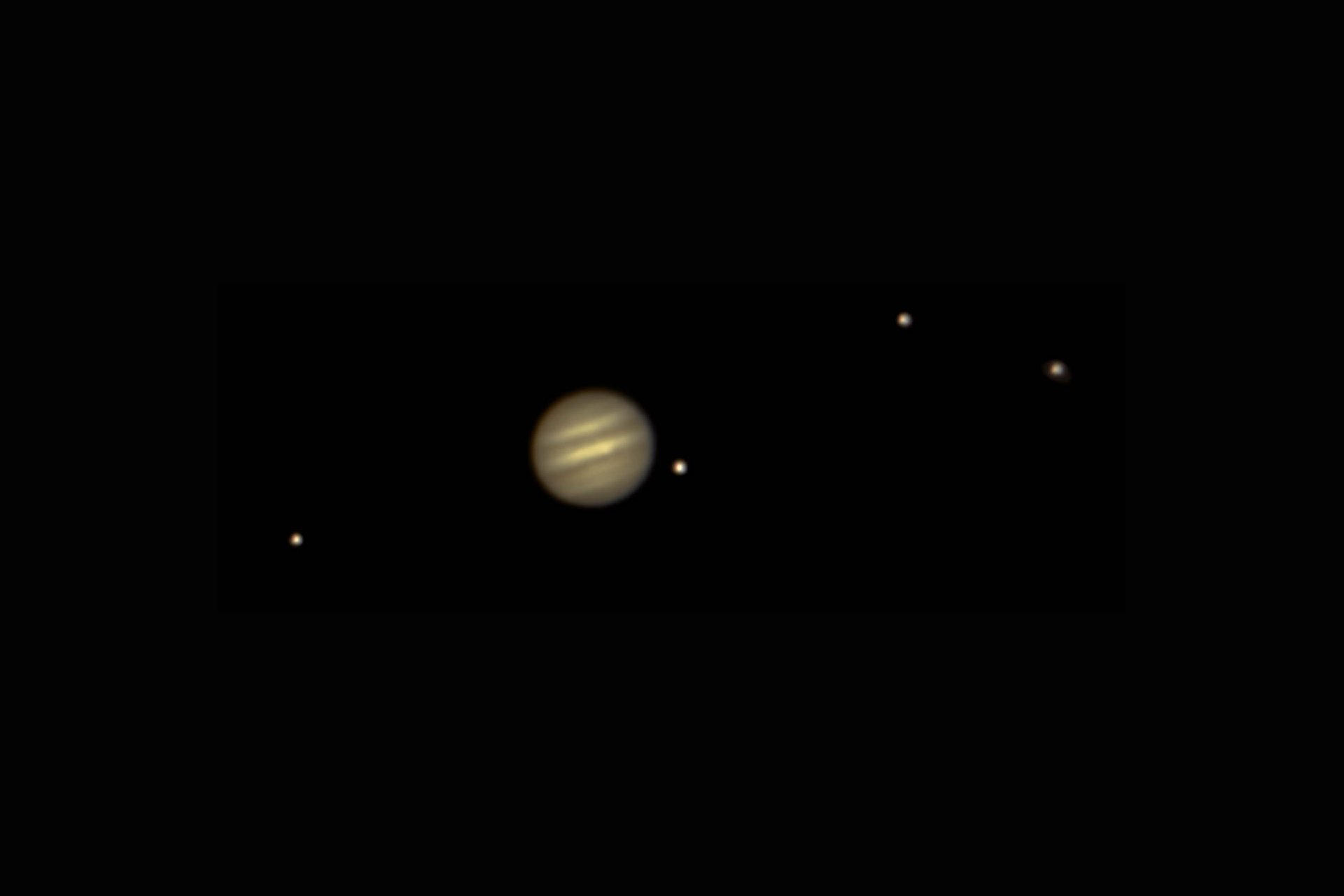 Jupiter in der Oppositionsnacht mit seinen 4 gut sichtbaren Monden Europa, Io, Ganymed und Callisto (von links nach rechts).