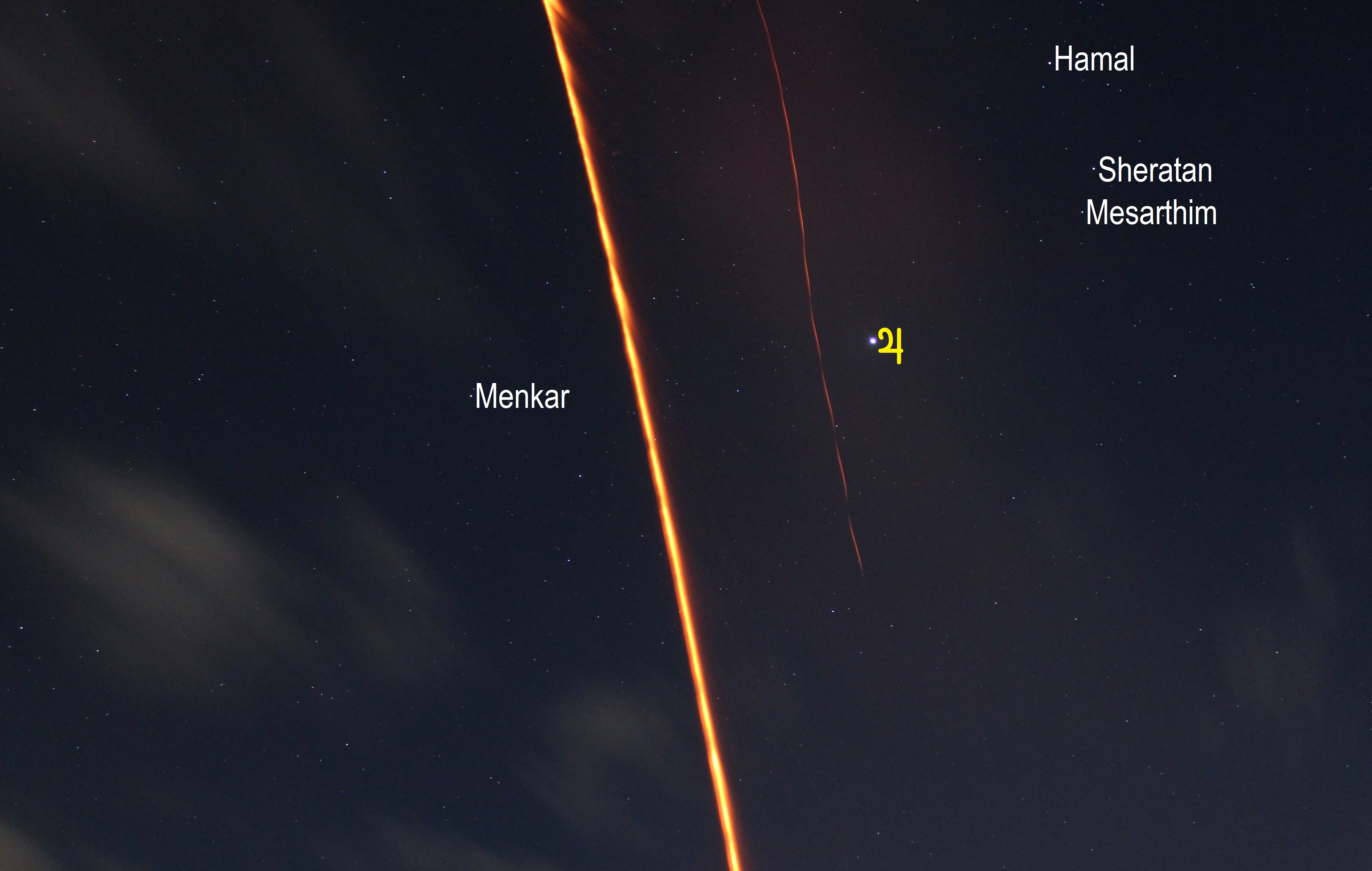 Die Silvesternacht 2023/2024 war endlich wieder halbwegs klar, was ich dazu nutzte, den Planeten Jupiter im Widder zu fotografieren. Und natürlich darf auf dem Bild auch nicht die Spur einer Feuerwerksrakete fehlen!