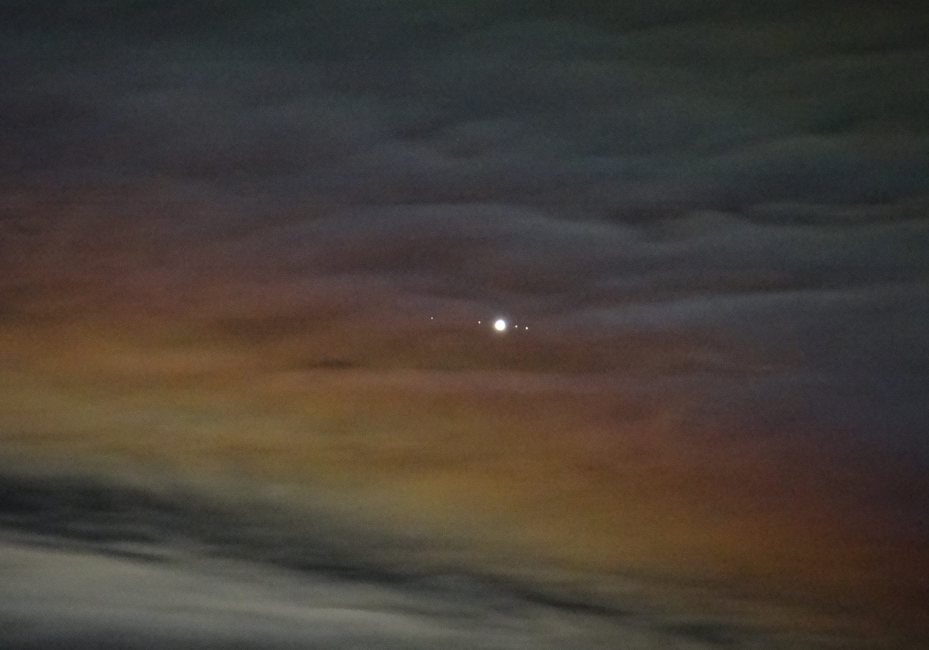 Am 6. Juli 2020 wollte ich mit meiner Digitalkamera ein Bild von Jupiter und seinen Monden schießen, allerdings kamen in der Nacht Wolken auf und der Vollmond stand nur wenige Grad entfernt. Ich dachte, das wird nichts. Umso überraschter war ich, Jupiter, Kallisto, Europa, Io und Ganymed (v.l.n.r.), durch eine irisierende Schleierwolke in Farbe getaucht, doch erwischt zu haben.