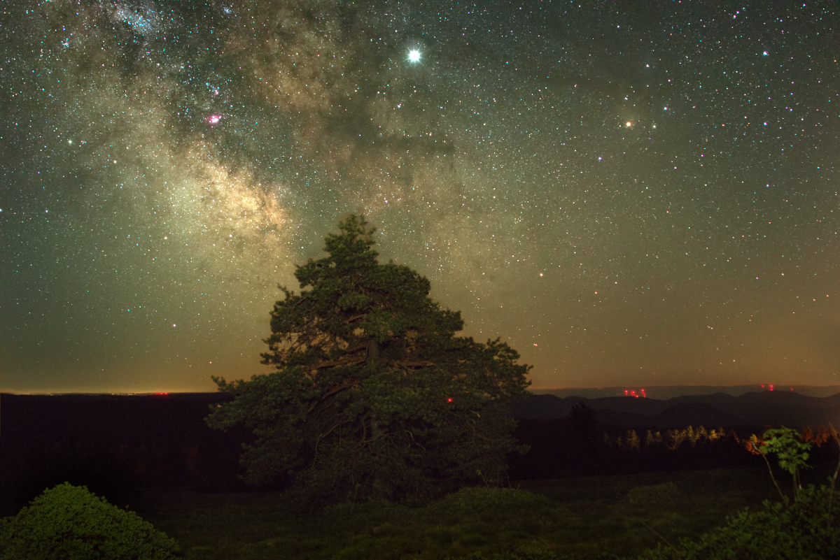 Der Gasriese Jupiter steht im Juni 2019 in Opposition zur Sonne. Auf dem Bild ist er das weitaus hellste Objekt. Zudem befindet sich der Planet in guter Gesellschaft, hält er sich doch nahe dem Michstraßen- Zentrum auf. Weiter westlich erkennt man den Kopf des Skorpion mit seinen gelblich leuchtenden Hauptstern Antares. Standort ist der 1054 Meter hohe Schliffkopf im Nordschwarzwald unweit der Schwarzwaldhochstraße B 500. Als Vordergrundmotiv dient eine wunderschöne Kiefer, gezeichnet von Wind und Wetter.