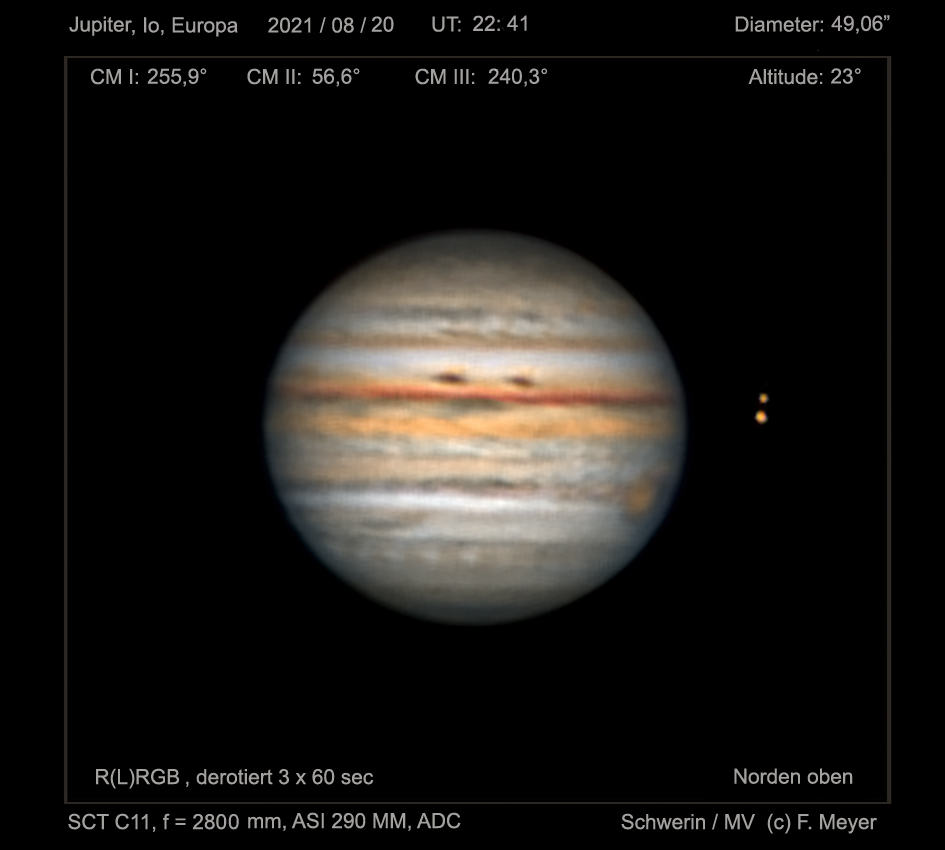 Leider erreicht Jupiter in diesem Jahr in Norddeutschland (Schwerin) nur eine Höhe von 23 Grad über dem Horizont. Das erschwert die Aufnahme von Videos und Bildern, da das Seeing nicht optimal sein kann. Trotzdem zeige ich hier mal das Ergebnis eines Versuchs. Interessant ist hier auch die Konjunktion der beiden Monde Io und Europa. Mit einem SCT C11, ADC und ASI 290 MM wurden pro Farbkanal mit FireCapture 60 sec Videos mit je etwa 7000 Frames aufgenommen und 36 Prozent der Einzelbilder genutzt. Die Derotation der RGB-Bilder erfolgte mit "Winjupos".
