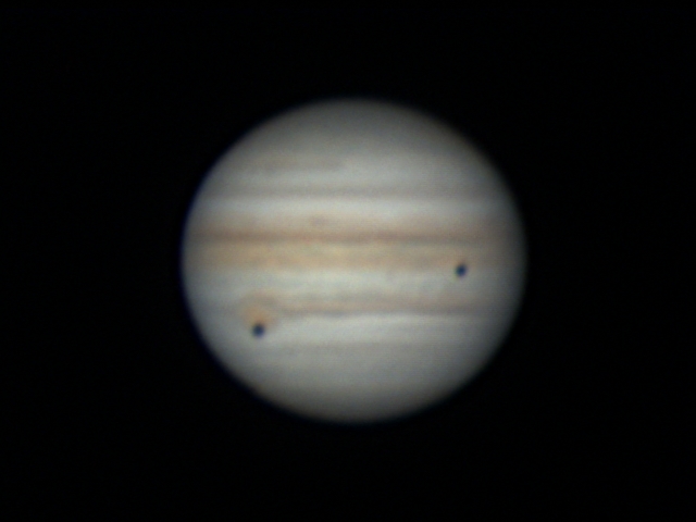 In der Nacht vom 29. auf den 30. Juli 2021 war es möglich, in Wolkenlücken ein paar Videosequenzen von Jupiter aufzunehmen. Bei dem linken dunklen Fleck direkt am GRF muss es sich nach Befragung von Planetariumprogrammen um Kallisto selbst handeln. Durch seine geringe Albedo ist Kallisto offenbar wesentlich dunkler als die Jupiterscheibe. Der rechte dunkle Fleck ist der Schatten von Io. Dagegen fällt Io selbst ein Stück links davon vor der Jupiterscheibe kaum auf.